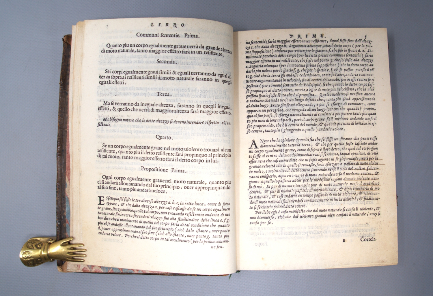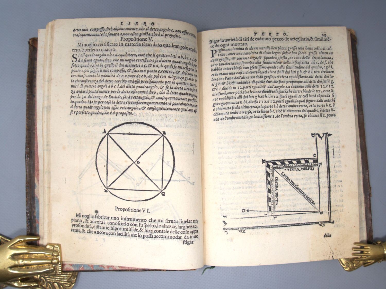 Das Titelblatt zeigt einen großformatigen Holzschnitt mit dem Wappen Francesco Maria II. della Roveres, Herzog von Urbino. Darunter eine beinahe ganzseitige allegorische Darstellung, in der Tartaglia im Zentrum verschiedener - weiblich personifizierter - Wissenschaftsdisziplinen erscheint, umgeben von Autoritäten der Antike wie Euklid, Aristoteles und Platon. – Innenspiegel mit zwei montierten Bibliotheksschildern (eines fast entfernt). Stockfleckig und papierbedingt gebräunt.