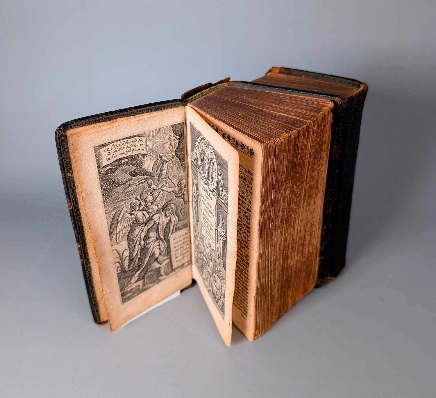 Biblia germanica. - Biblia das ist die gantze Heilige Schrift Deutsch: D. Mart. Luthers. 48 Bl., 408 S.; 1 Bl., 542 S.; 1 Bl. 590 S.; 1 Bl., 426 S., 4 Bl. Mit gestochenem Frontispiz, Kupfertitel, 3 Holzschnitt-Bordüren und 1 Holzschnitt-Druckermarke. 14 x 7 cm. Leder d. Z. (bestoßen, wenige Wurmlöcher, Leder etwas brüchig) als Dos-à-Dos-Einband mit Blindprägungen und Datierung "1628" auf den Deckeln. Lüneburg, Stern, 1627.
