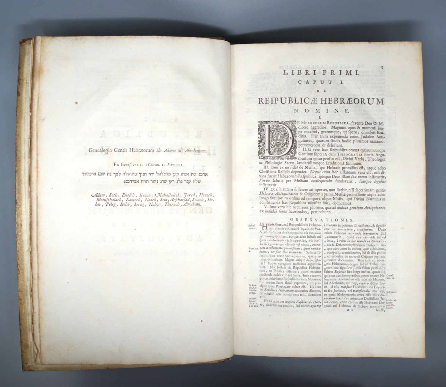 Leydecker, Melchior. De republica Hebraeorum libri XII. Porrò antiquitates Judaeorum. 5 Bl., 702, 96 S., 6 Bl. Titel in Rot und Schwarz. Mit Kupfertitel und gestochener Titelvignette (ohne das gestochene Portrait). 33,5 x 20,5 cm. Blindgeprägter Pergamentband d. Z. (fleckig und berieben, mit hs. RTitel). Amsterdam, Isaak Stokman, 1704.