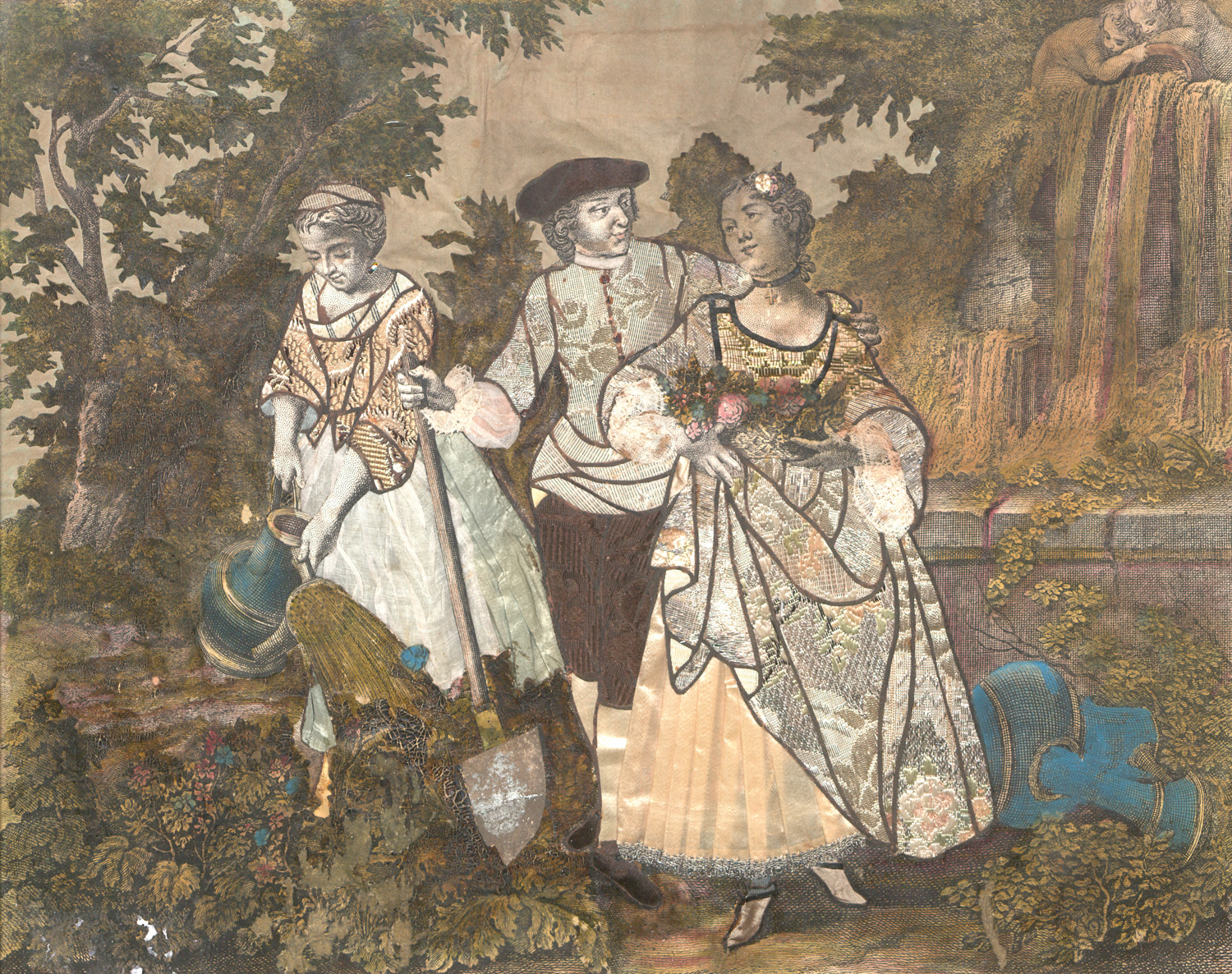 Dargestellt sind die vier Jahreszeiten mit unterschiedlichen typischen Aktivitäten: Der Winter zeigt Schlittschuhfahrer; der Frühling zeigt Bauern beim Bestellen des Feldes; der Sommer, wie die Ähren eingeholt werden; der Herbst die Weinauslese. Alle vier Stiche sind mit reichlichen Stickereien und Messingplättchen bestückt. – Etwas gebräunt, gewellt und feuchtfleckig. Sehr dekorativ.