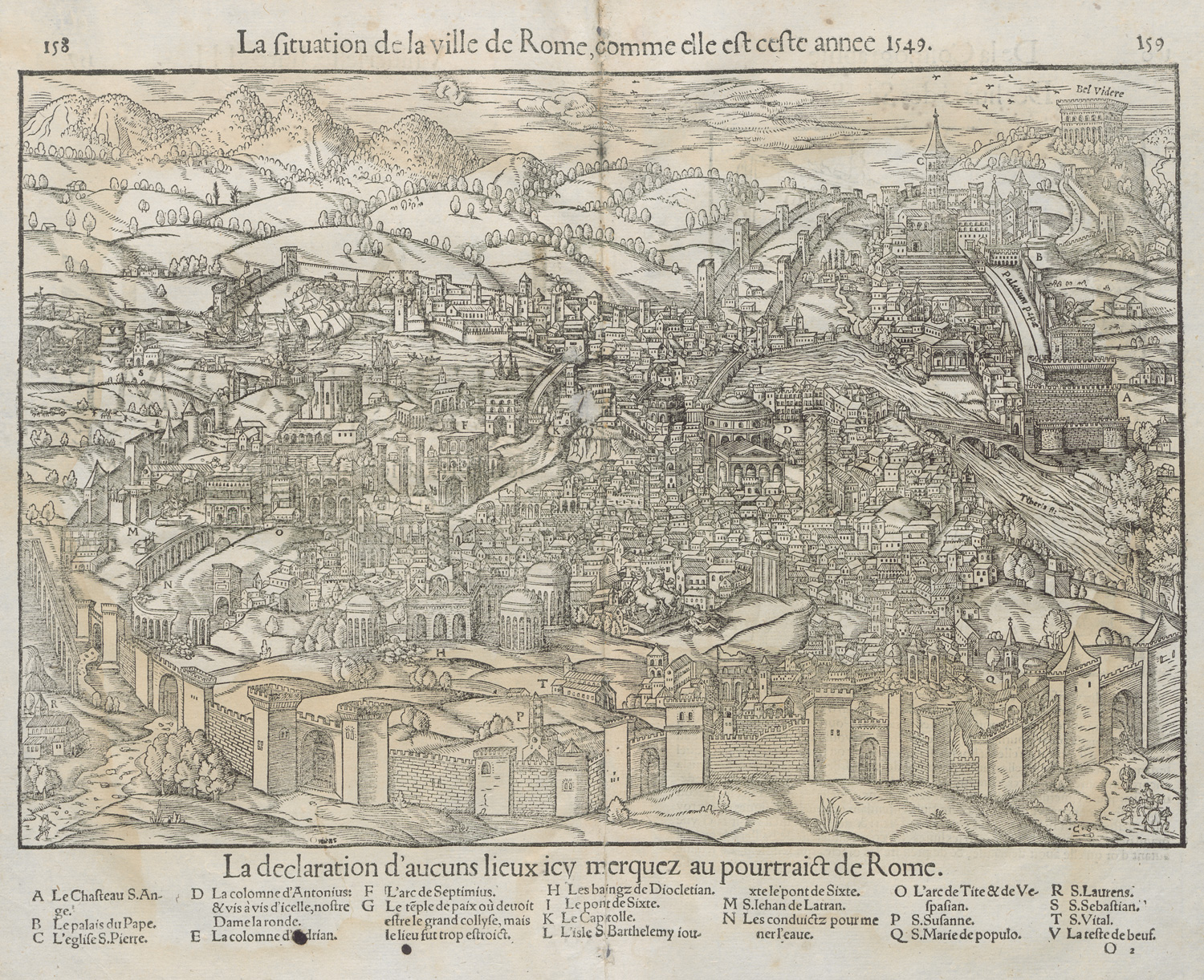 VD16 M 6715. – Aus einer frühen französischen Auflage. Die doppelblattgroße Stadtansicht stellt Rom im Jahr 1549 dar, verso ein halbseitiger Holzschnitt dreier Sybillen. – Mittelfalz verso hinterlegt und mit Einriss. Großer Wasserfleck, dadurch teils leicht gebräunt. Durch kleinen Einriss, minimaler Darstellungsverlust.
