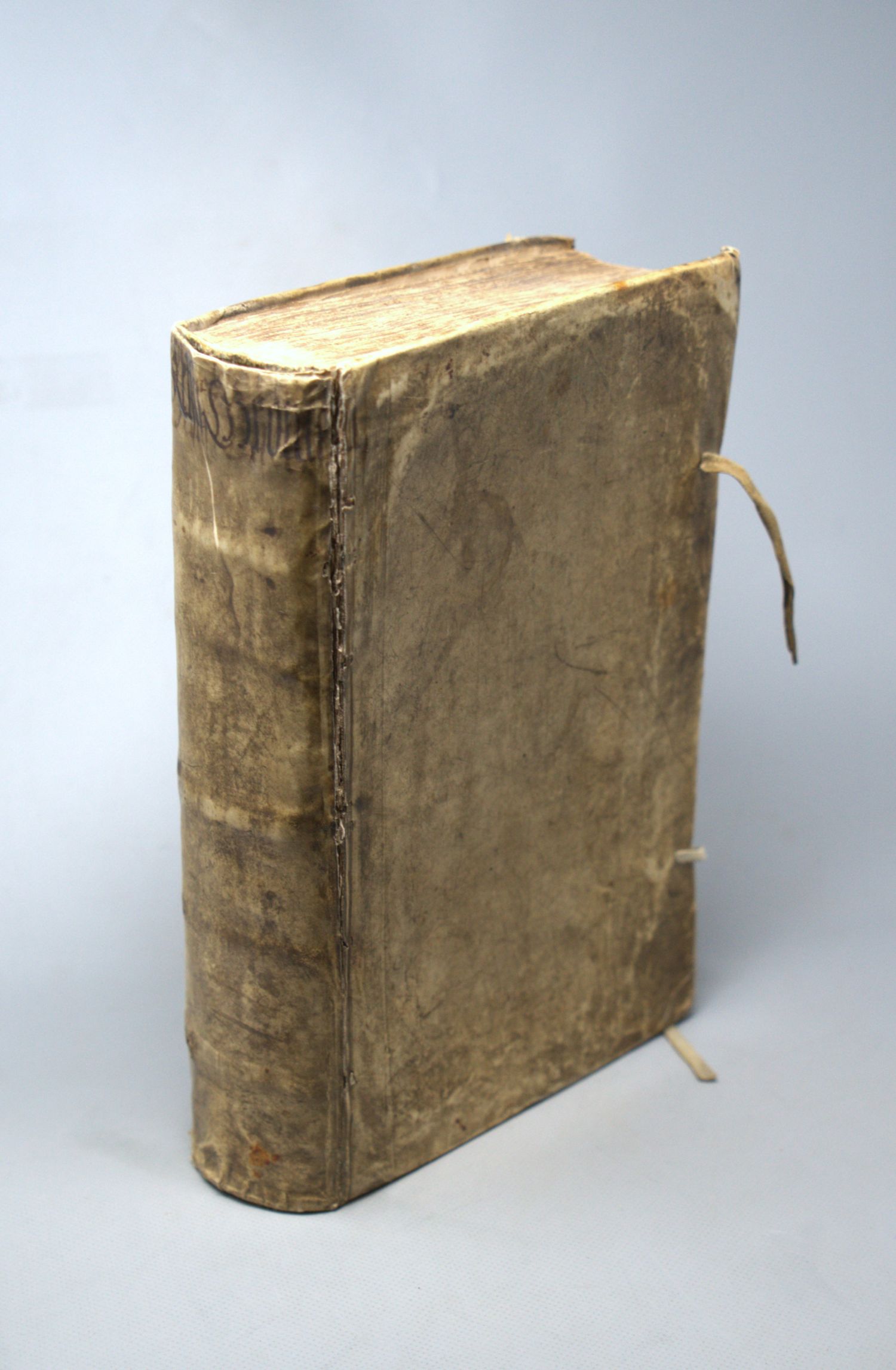 Strada à Rosenberg, Octavius de. Newe Keyser Chronick: Das ist, Wahrhaffte und vollkommene Beschreibung aller Römischen Keyser. Beneben Beschreibung ihrer aller, auch ihrer Gemahlinnen und Kinder Leben. Nunmehr aber biß auff gegenwertige Zeit also den Monat Aug. 1628 vollnführet und continuirt. 4 (statt 5) Bl. 596 S., 6 Bl. (l. w.). Mit szenischer gestochener Titelbordüre, Wappenkupfer und rund 570 Münzkupfern im Text. 29,5 x 19 cm. Pergament d. Z. (stärker fleckig und berieben, vorderes Gelenk geplatzt, mit hs. RTitel, Schließbänder teils lädiert). Frankfurt, Eberhard Kieser, 1629.