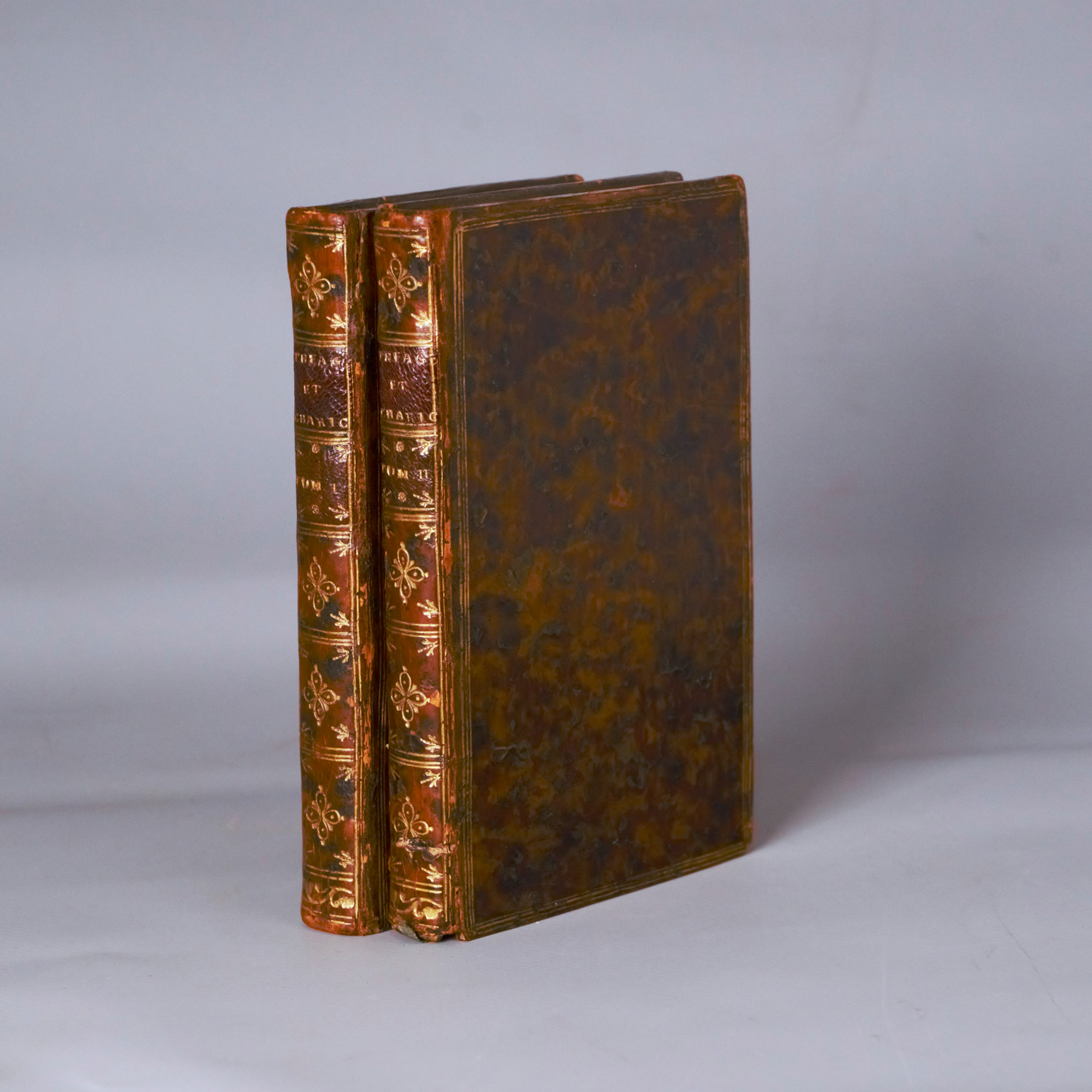 (Heliodor). Amours de Theagenes et Chariclee. Histoire ethiopique. 2 Bände. X, 213 S.; 1 Bl., 190 S. Titel in Rot und Schwarz. Mit 2 Kupfertitel, 2 gestochenen Titelvignetten, 10 Kupfertafeln und 10 gestochenen Textvignetten. 15 x 9,5 cm. Marmorierte Lederbände d. Z. (gering berieben, ein Rückenfeld mit Wurmspur) mit ornamentaler RVergoldung, je 2 roten goldgeprägten RSchildern und dreifacher Deckelfilete. Paris, Coustelier, 1743.