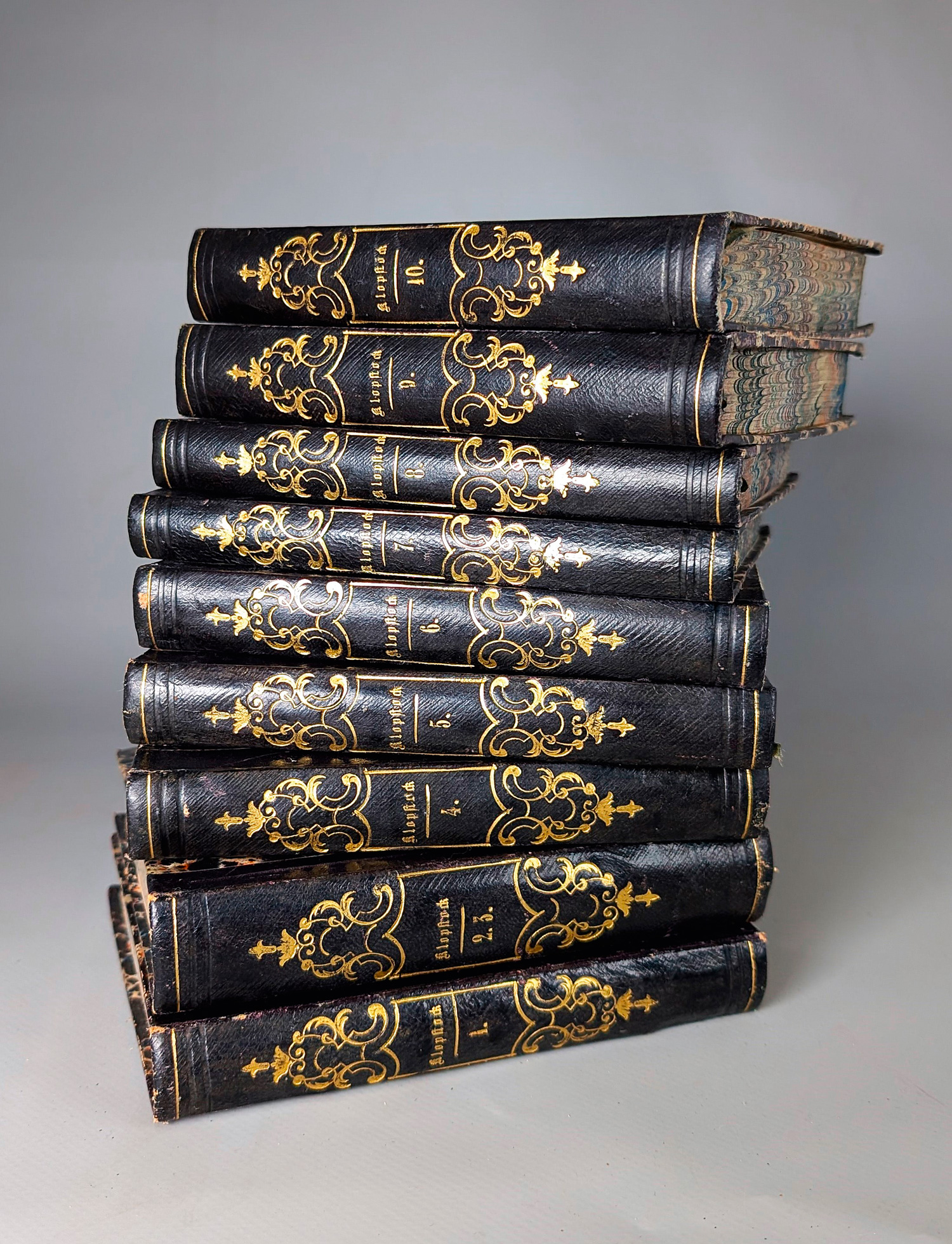 Klopstock, Friedrich Gottlieb. Sämmtliche Werke. 10 Teile in 9 Bänden. 14,5 x 11 cm. Schwarze Halbchagrinlederbände d. Z. (gering berieben) mit Romantiker-RVergoldung. Leipzig, G. F. Göschen 1854-1855.