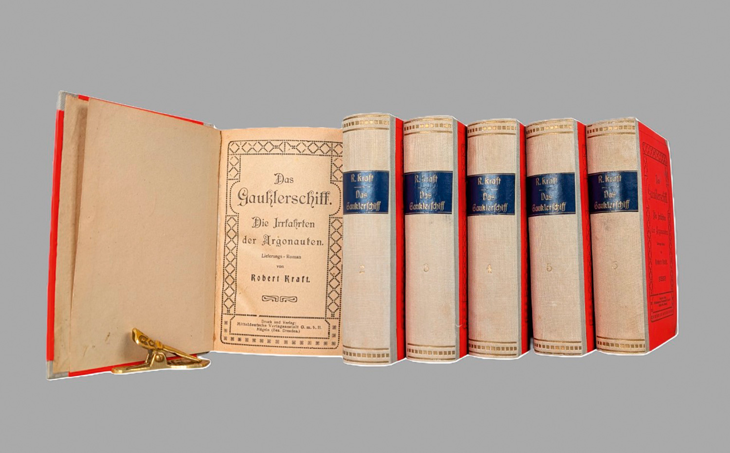 Kolportage. - Kraft, Robert. Das Gauklerschiff. Die Irrfahrten der Argonauten. Lieferungs-Roman. 3840 S. in 6 Bänden. Mit zahlreichen Textillustrationen. 17 x 11,5 cm. Etwas spätere Halbleinenbände (leicht fleckig) mit RVergoldung, goldgeprägtem RSchild und montierten roten Kopien der Titelblätter auf den VDeckeln. Mügeln (Dresden), Mitteldeutsche Verlags GmbH, (1918).