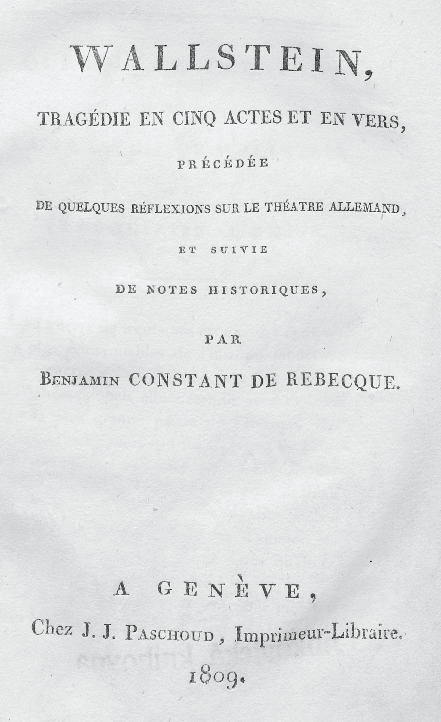 Schiller, F. - Constant de Rebecque, B. (de). Wallstein, tragédie en cinq actes et en vers, précédée de quelques réflexions sur le théatre allemand, et suivie de notes historiques. 2 Bl., LII, 214 S., 1 Bl. 22 x 14 cm. Interimsbroschur d. Z. (mit Gebrauchsspuren) in moderner Pappkassette mit goldgeprägtem RSchild. Genf, J. J. Paschoud, 1809.