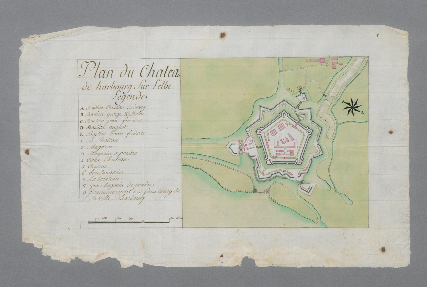 Hamburg. Plan du château de Harbourg sur l'Elbe. Kolorierte Tuschezeichnung. 17 x 28,5 cm (Darstellung) bzw. 24 x 38,5 cm (Blattgröße). Paris um 1750.