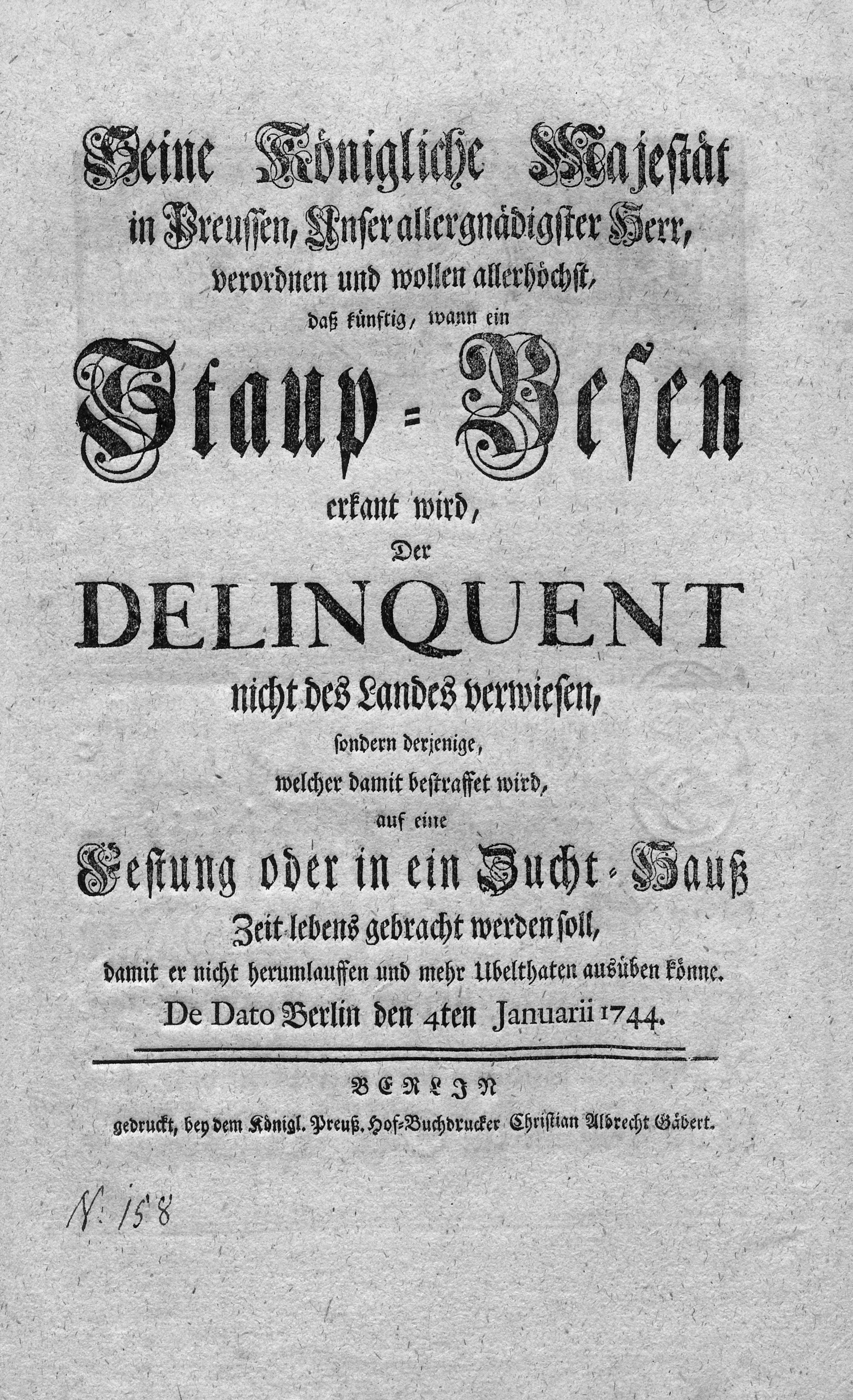 3) Seine Königliche Majestät in Praussen, Unser allergnädigster Herr, verordnen und wollen allerhöchst, daß künftig, wann ein Staup-Besen erkant wird, Der Delinquent nicht des Landes verwiesen, sondern derjenige, welcher damit bestraffet wird auf eine Festung oder in ein Zucht-Hau Zeit lebens gebracht werden soll, damit er nicht herummlauffen und mehr Ubelthaten ausüben könne. De Dato Berlin, den 4ten Januarii 1744.