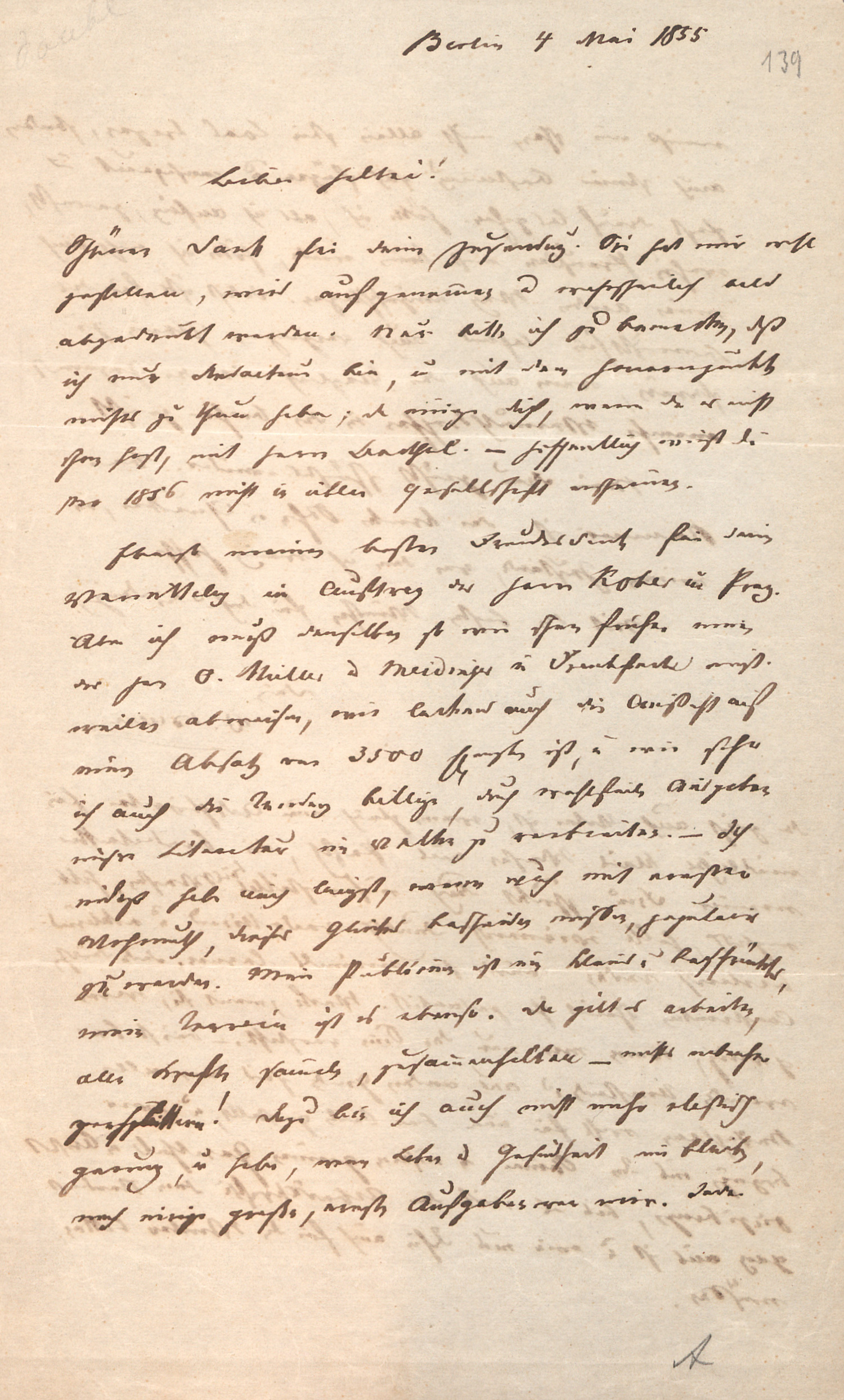 An den ihm befreundeten Schauspieler, Bühnenautor und Vortragskünstler Carl von Holtei. Bedankt sich für die Zusendung eines Manuskripts von Holtei, das er zum Abdruck befördern werde. "... Sie hat mir recht gefallen, wird aufgenommen u. wahrscheinlich bald abgedruckt werden. Nur bitte ich zu bemerken, dass ich nur Redacteur bin u. mit dem Honorarpunkt nichts zu thun habe; da einige Dich, wenn Du es nicht schon hast, mit Herrn Barthel. - Hoffentlich wirst Du per 1856 nicht in übler Gesellschaft erscheinen ...". Geht dann ausführlich auf eigene Arbeit ein und nennt mancherlei Schwierigkeiten. "... Hätte ich, als ich anfing, gewußt, wohin Preußen einst kommen würde, hätte ich wohl auch einen andern Weg eingeschlagen ...". Behandelt schließlich noch familiäre Nachrichten.