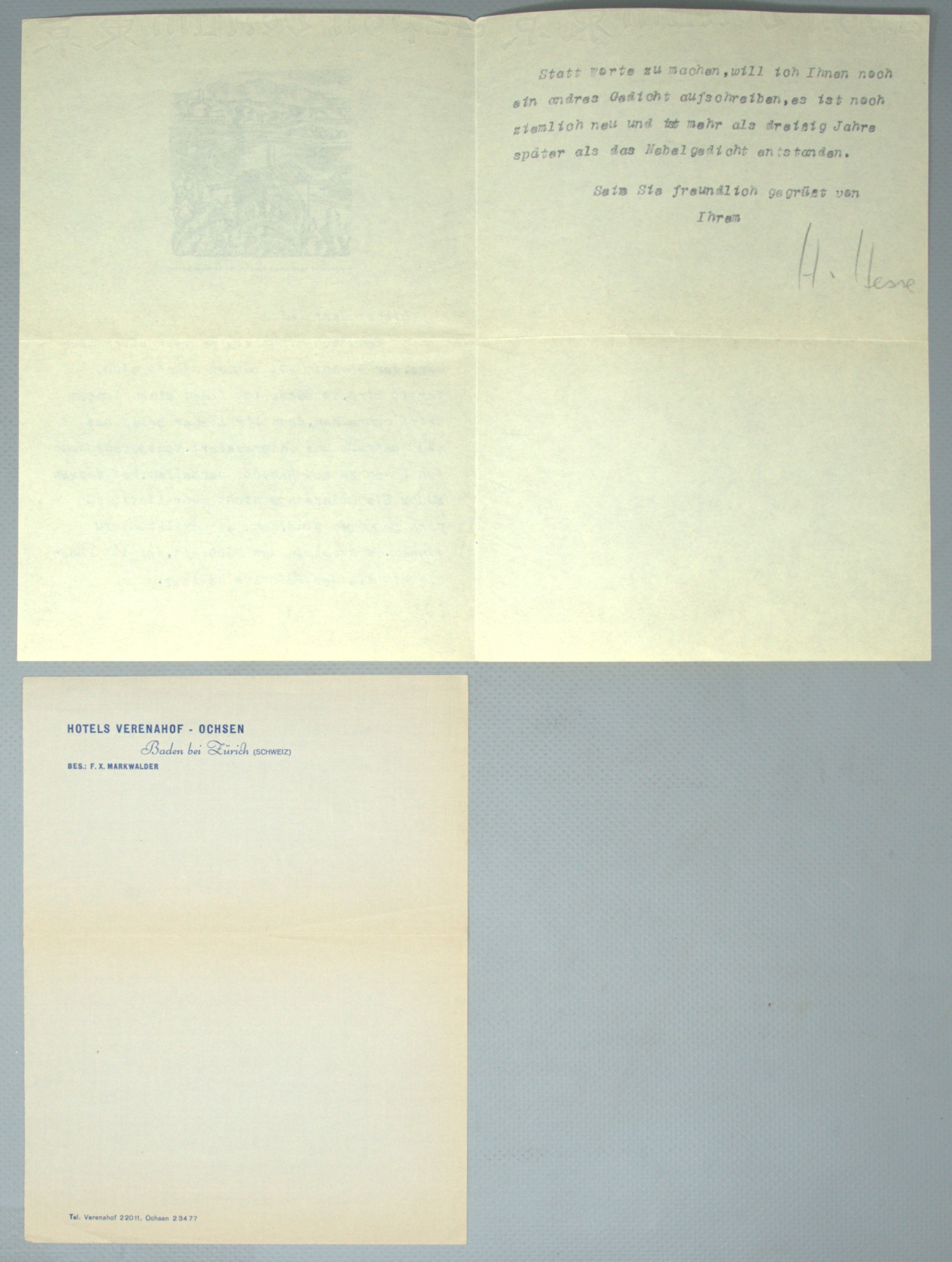 I. Masch. Brief m. U. "H. Hesse". 11/3 S. Doppelblatt mit Holzschnitt im Briefkopf nach einem Aquarell des Autors. Gr. 8vo. O. O. (wohl um 1941). - An einen Herrn Joseph Delz, der vergeblich nach Hesses Gedicht "Im Nebel" gesucht hatte. "... Wenn ich nicht ein kranker alter Mann wäre, der ohnehin mit seiner Arbeit nicht fertig wird, so würde ich Ihnen einen langen Brief schreiben, denn Ihr lieber Brief hat mich gefreut und interessiert ...". Er könne ihm aber zu dem Gedicht verhelfen: "... es war leicht zu finden. Es steht in dem Büchlein, das ich Ihnen als ein kleines Geschenk beilege. Statt Worte zu machen, will ich Ihnen noch ein andres Gedicht aufschreiben, es ist noch ziemlich neu und ist mehr als dreißig Jahre später als das Nebelgedicht entstanden ...". - II. Dieses Gedicht-Typoskript mit eigh. Unterschrift "Gruss von H. Hesse". 1 S. Auf der Rückseite eines Briefbogens des Hotels "Verenahof-Ochsen" in Baden bei Zürich. Kl. 4to. O. O. (wohl um 1941). - "Flötenspiel". 3 Strophen zu je 4 Zeilen. - Das Gedicht entstand 1940. - III. Eigh. Widmung "Herrn Jos. Delz mit Grüssen von H. Hesse". Auf dem Vorsatz des Insel-Bändchens "Vom Baum des Lebens. Ausgewählte Gedichte." 41.-50. Tsd. Leipzig, Insel-Bücherei Nr. 454, (wohl um 1940).