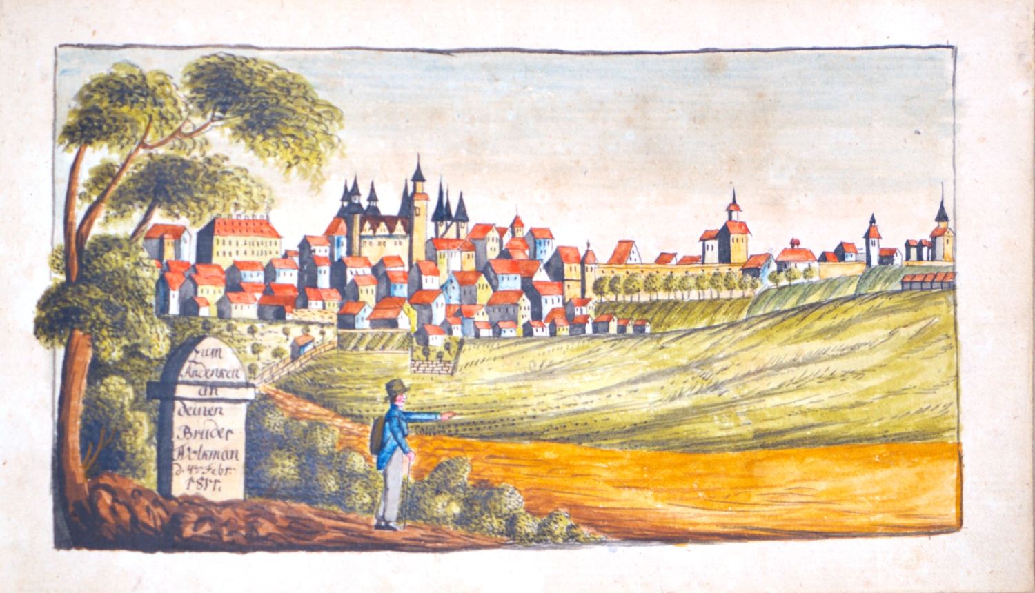Fast alle Eintragungen von Freundinnen und Freunden in Merseburg. Eines der Aquarelle zeigt eine hübsche farbige Gesamtansicht von Merseburg, gefertigt vom "Bruder Friedrich Volckmann" der Stammbuch-Inhaberin. Ein anderes Blatt enthält eine Landschaft mit einer Vase im Mittelpunkt, darüber eine aus den Wolken kommende Hand, die eine Waage mit den Schalen "Liebe" und "Schmerz" hält. Die anderen reizvollen Malereien, teils mit Deckfarben, zeigen Blumengebinde. - Lose beiliegend 1 Blatt mit Aquarell von 1820, ferner 2 vielleicht nicht hierzu gehörige Blätter mit einer Blumenstickerei bzw. einem kolor. Kupferstich. - Stellenweise leicht gebräunt, sonst gut erhalten.
