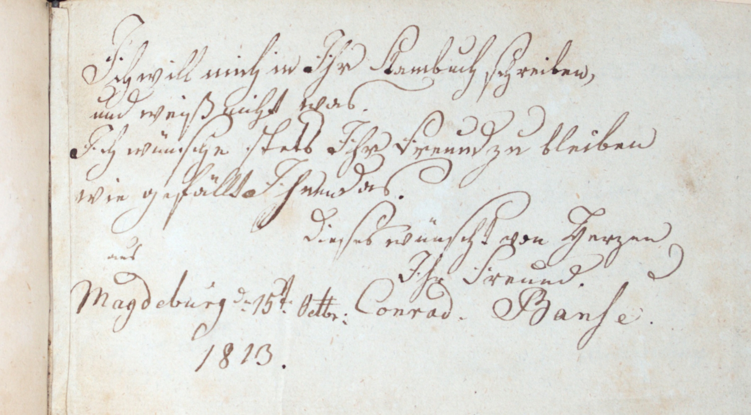 Stammbuch einer jungen Dame in Merseburg. Ca. 71 Bl., davon 28 S. beschrieben oder illustriert. Mit 6 Aquarellen. Quer-8vo. Ziegelroter Pappband d. Z. mit schwarzem Rücken und der Aufschrift "pour mes amies"; Deckel und Rücken mit goldgeprägten Bordüren und Eckfleurons, die Deckel mit grünem ovalen Mittelstück, gleichfalls mit floraler Goldprägung. Goldschnitt und marmorierte Vorsätze. In marmoriertem Karton-Umschlag (dieser beschabt). 1811-1820.