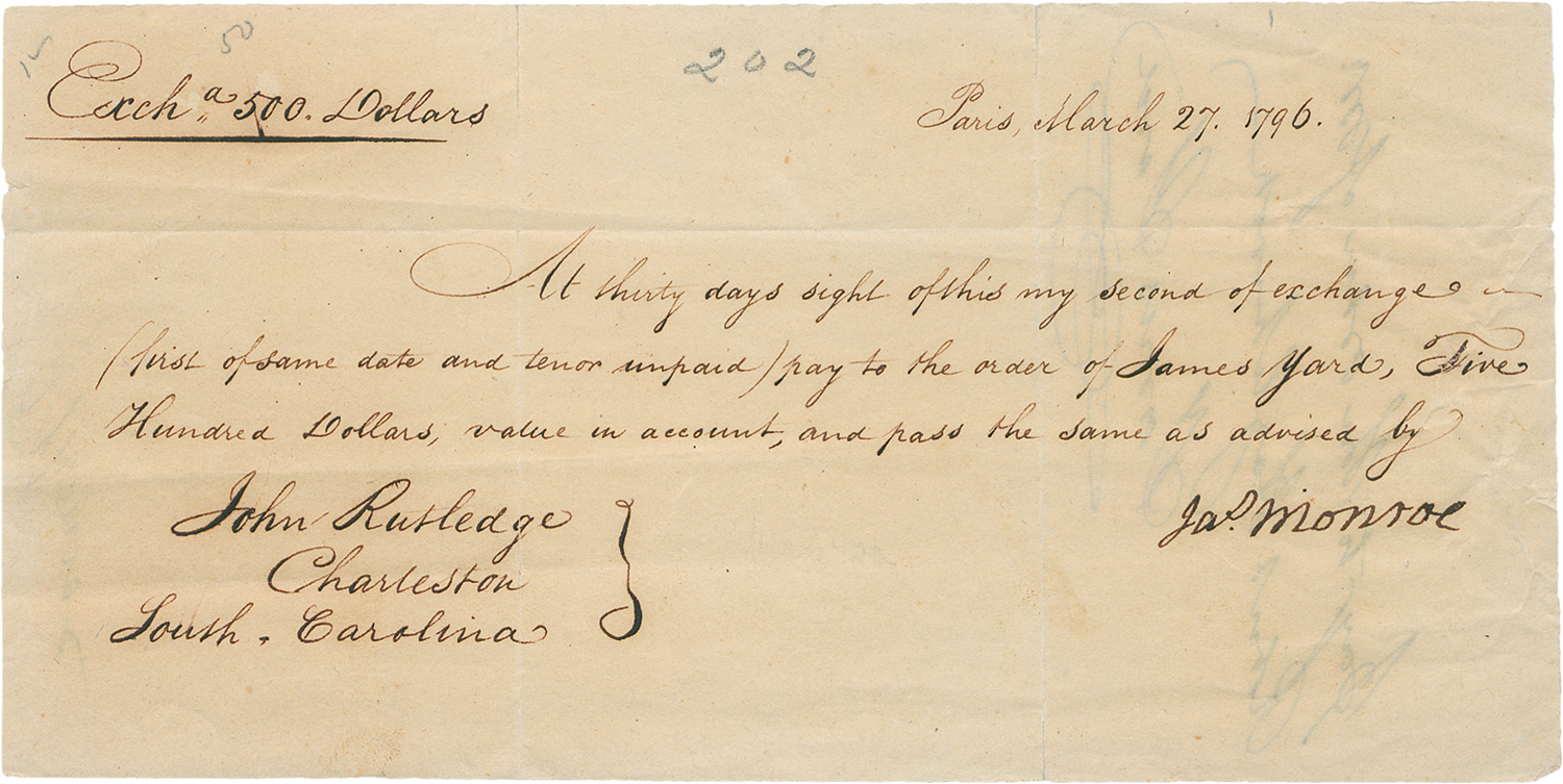 Handschriftlicher Wechsel (check) über die Zahlung von 500 Dollars an James Yard. "At thirty days sight of this my second of exchange (first of same date and tenor unpaid) pay to the order of James Yard, Five Hundred Dollars, value in account, and pass the same as advised by Jas Monroe". - Faltenrisse. - Beiliegend eine amerikanische Beschreibung dieses frühen Checks: "Request by James Monroe later 5th President of the United States to John Rutledge of Charleston, South Carolina (a signer of the American Constitution) to pay Dollars 500.00 to one James Yard. This represents also an example of an early American Check."