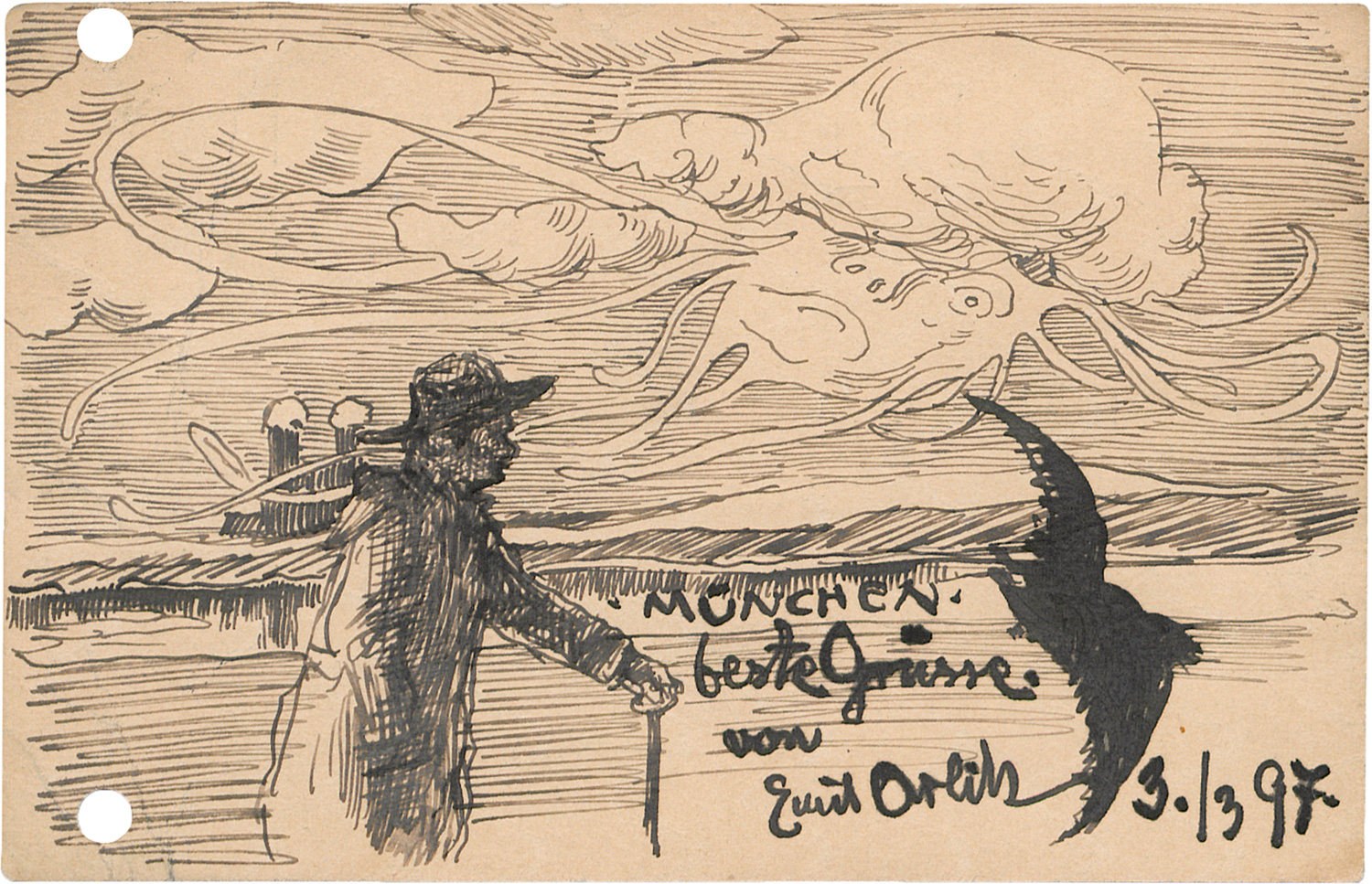 An den Komponisten Oskar Fried in Paris gerichtete Grüße, mit noch deutlich vom Jugendstil geprägter Federzeichnung. Sie zeigt im Vordergrund einen Wanderer mit Hut und Stock sowie einen im Tiefflug vorbeisegelnden Vogel, im Hintergrund die Türme der Münchener Frauenkirche, am Himmel eine große Wolke mit menschlichem Gesicht. - Gelocht.
