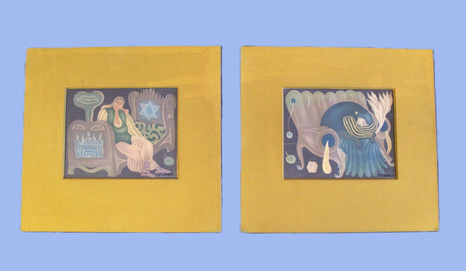 Brauer, Arik. "Das Ruhebett" (Le Lit) und "Der Schlaf" (Le Sommeil). 2 Blätter aus "XX Chassidische Erzählungen / XX Récits Hassidiques". Originale Farbradierungen. Ca. 20,5 x 25,5 cm. Unter Glas gerahmt in mächtige, leinenbezogene Holzrahmen (gering angestaubt, leicht bestoßen) 41,5 x 44 cm. (Frankfurt, Editeuropa & Galerie Sydow 1972-1973).
