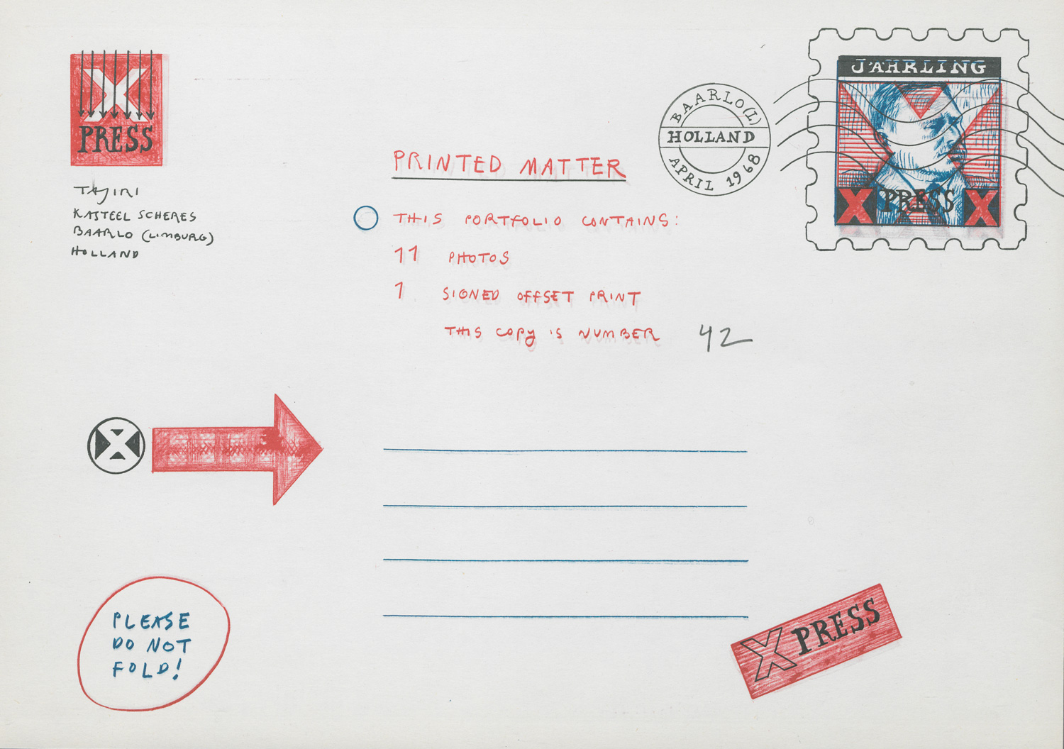 Eines von 250 handschriftlich nummerierten, von Tajiri signierten Exemplaren der ersten Edition, die der Künstler selber verlegte. Enthält ein Titelblatt, ein Textblatt, ein Kolophonblatt, 14 Fototafeln, in einem gängigen, von Tajiri selbst beschrifteten Briefkuvert (Titel, Auflage und Signatur). – Der Umschlag etwas vergilbt, sonst wohlerhalten.