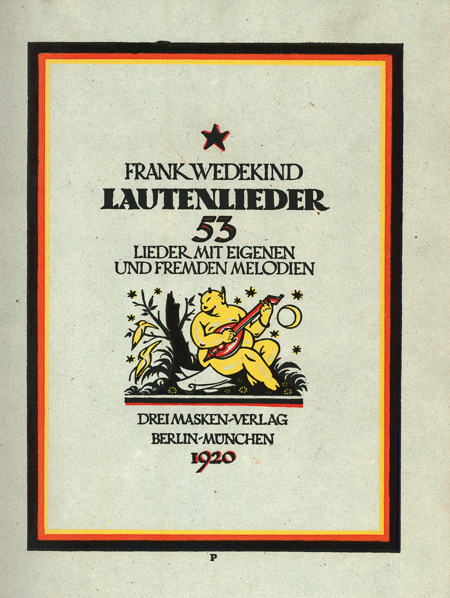 Wedekind, Frank. Lautenlieder. 53 Lieder mit eigenen und fremden Melodien. 173 S., 1 Bl. Mit dreifarbiger Titelillustration und 108 Schattenriss-Vignetten von Emil Preetorius. 32 x 23,5 cm. Roter geglätteter OKalblederband (berieben, beschabt und etwas bestoßen) über 4 Zierbünden mit goldgeprägtem RTitel, Blindfileten auf den Deckeln und goldgeprägter VDeckelvignette (Entwurf von Emil Preetorius). Berlin und München, Drei Masken-Verlag, 1920.