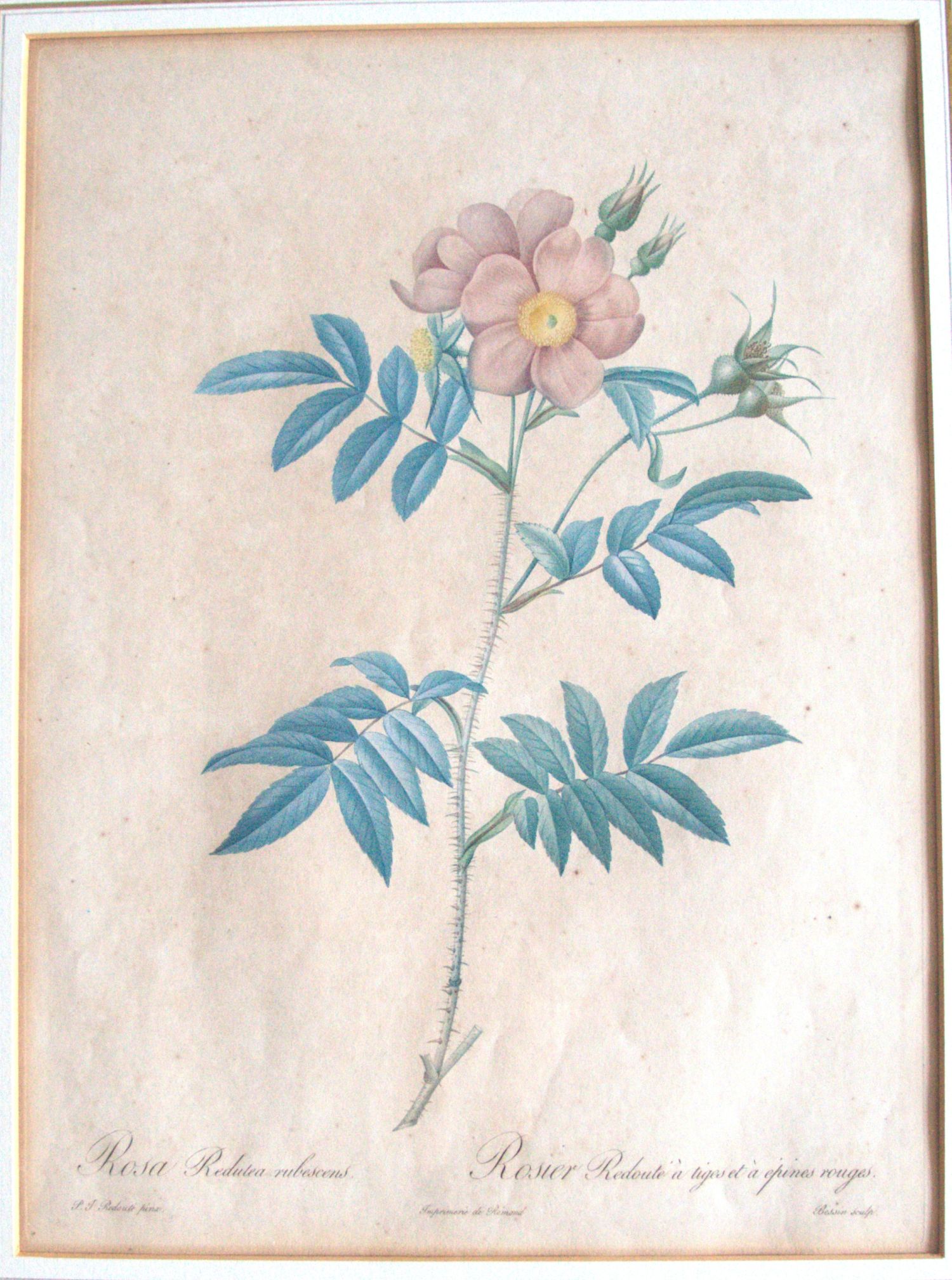 Vgl. Nissen 1599. – Vorhanden sind: "Rosa Indica", "Rosa Multiflora carnea", "Rosa Kamtschatica" und "Rosa Redutea rubescens" aus der Folio-Ausgabe Redoutés einflussreichen Blumenwerks "Les roses". – Nicht ausgerahmt, Versand nur ohne Rahmen. Teils stark gebräunt und etwas fleckig. In der besonderen Technik des Farbstichs und mit zusätzlicher feiner Kolorierung.