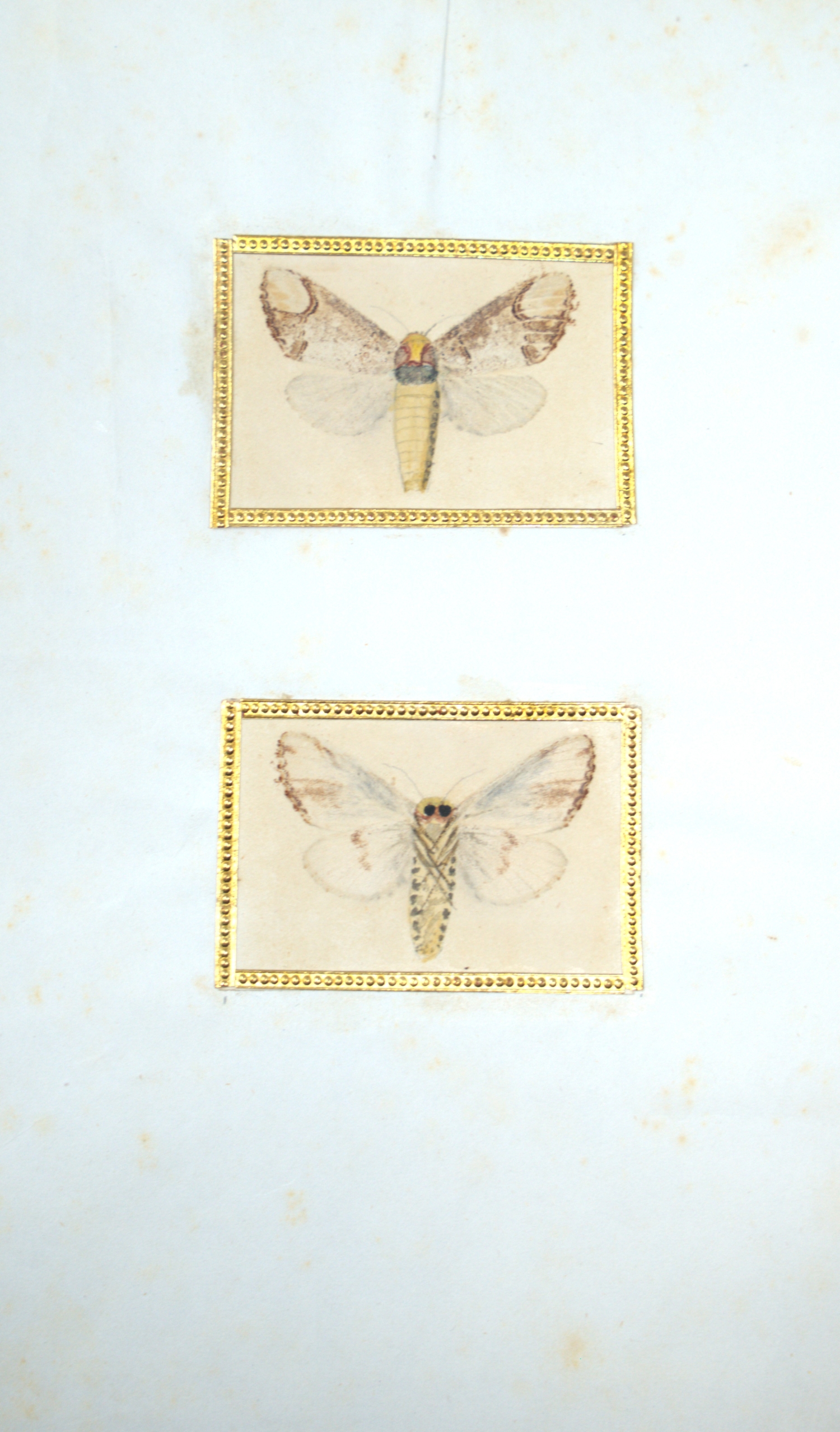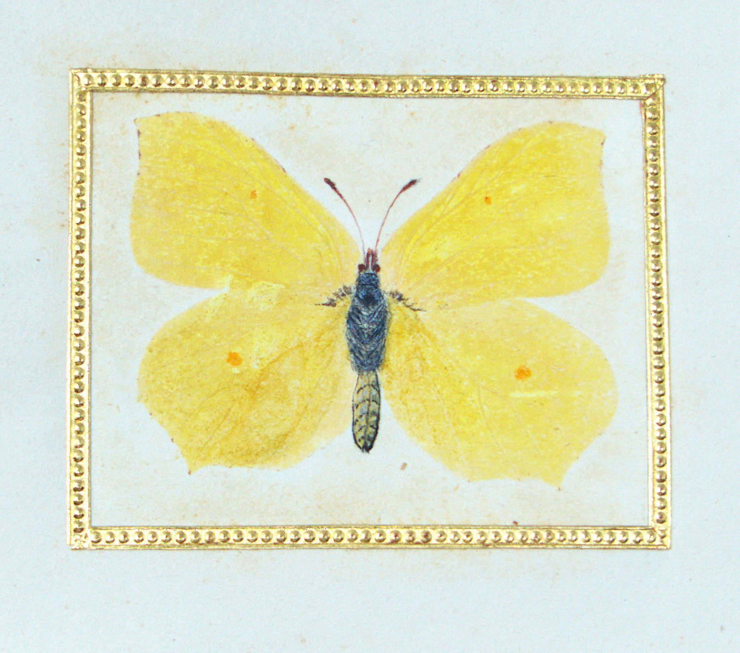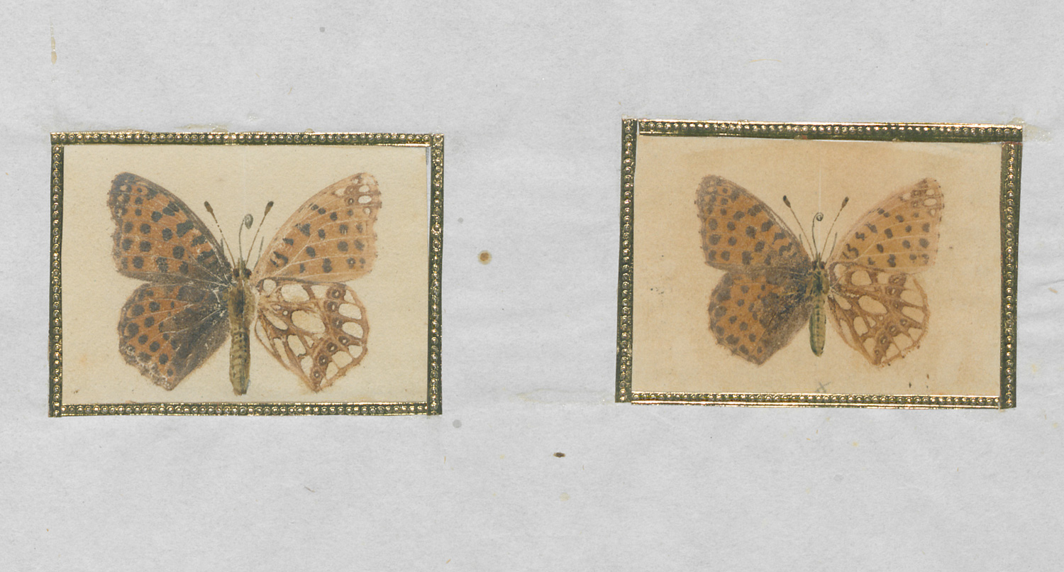Umfangreiche Sammlung von ca. 135 naturgetreuen Darstellungen verschiedener Schmetterlinge und Motten, angelegt von einem kenntnisreichen Entomologen mit Hilfe des tierischen Naturselbstdrucks, bei dem durch Pressung von Insektenflügeln massstabsgetreue und überaus feine und detailgetreue Abbildungen der naturgegebenen Strukturen erreicht werden. Die Insektenkörper sind vom Druck ausgenommen und jeweils fein aquarelliert. Jeder Druck ist von einer geprägten Goldbordüre dekorativ eingefasst. Einige der Trägerblätter mit Gattungsbezeichnung, u. a. Pontia brassicae, Vanessa prorsa, Ennomus prunaria, Phlogophora meticulosa, Colias, Pygaera und Hylina. Format: ca. 2 x 3,5 bis 6,5 x 7 cm (Goldbordüre). – Trägerblätter stockfleckig, einige wenige auch mit stärkeren Quetschfalten und Knicken. Die minutösen Darstellungen nicht betroffen.