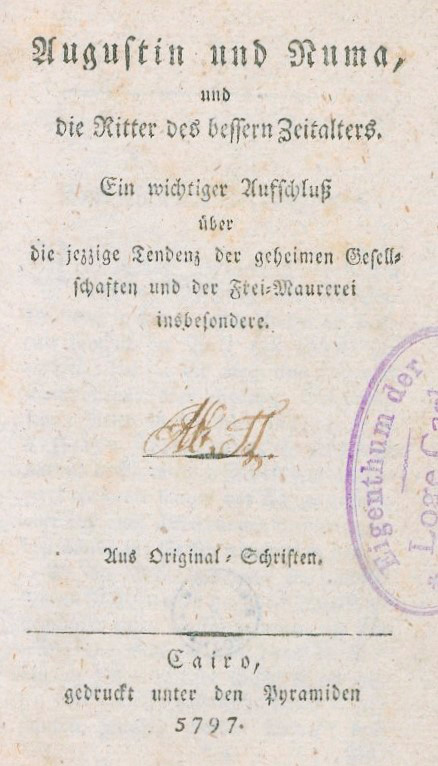 Augustin und Numa, und die Ritter des bessern Zeitalters. Ein wichtiger Aufschluß über die jezzige Tendenz der geheimen Gesellschaften und der Frei-Maurerei insbesondere. Aus Original-Schriften. 103 S. 16,5 x 10 cm. Halbleinen um 1850. Cairo, gedruckt unter den Pyramiden 5797 (d. i. Köthen, Aue, 1797).