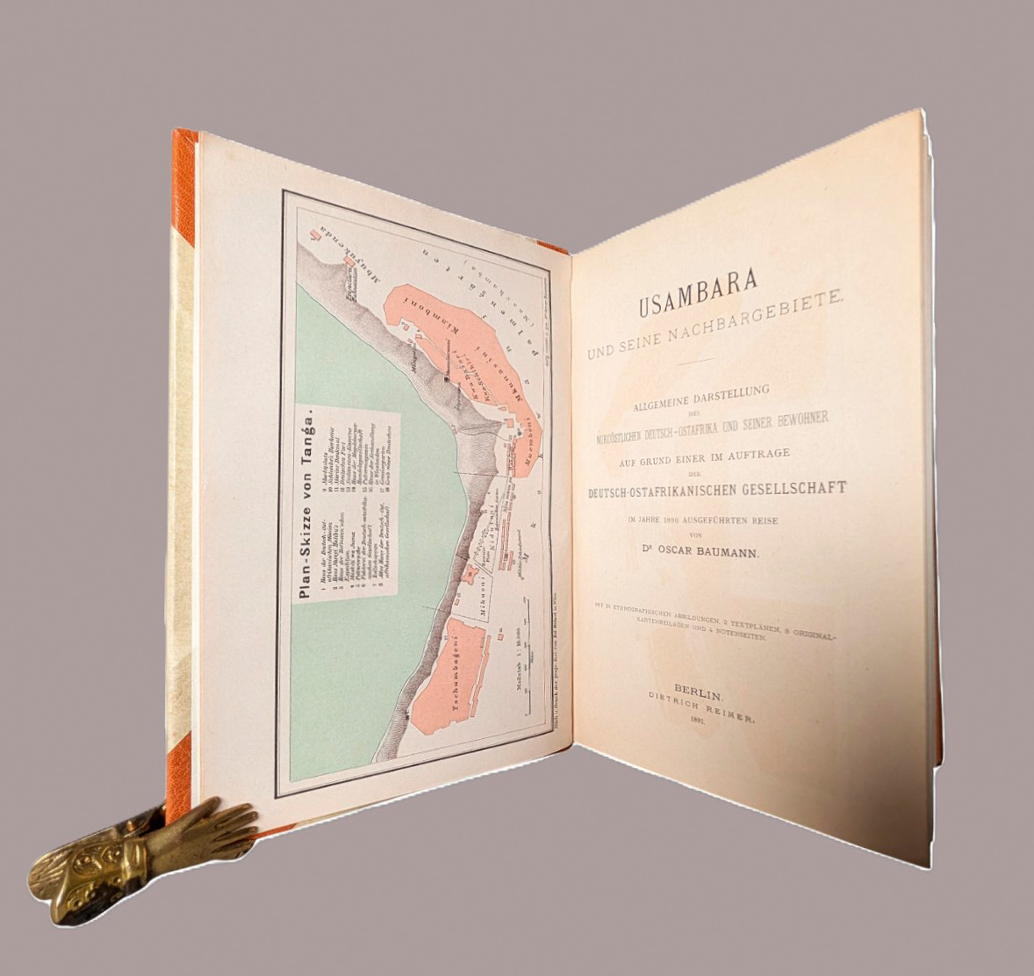 Baumann, Oscar. Usambara und seine Nachbargebiete. Allgemeine Darstellung des nordöstlichen Deutsch-Ostafrika und seiner Bewohner auf Grund einer im Auftrage der Deutsch-Ostafrikanischen Gesellschaft im Jahre 1890 ausgeführten Reise. XI, 375 S. Mit 24 Textillustrationen, 2 Plänen, 4 Karten und großformatiger vierteiliger Übersichtskarte. 23 x 15 cm. Moderner Halblederband mit RVergoldung und 2 farbigen goldgeprägten RSchildern. Berlin, Dietrich Reimer, 1891.
