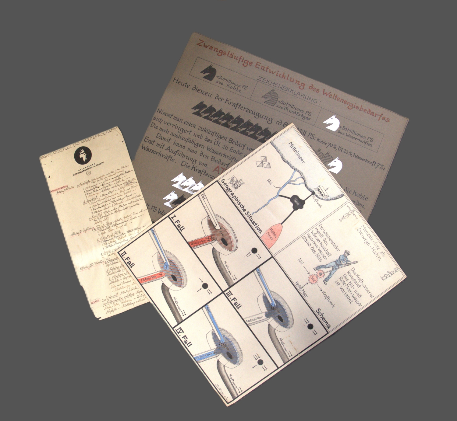 Umfangreiche Vorstellung des Atlantropa-Projekts von Herman Sörgel (1885-1952) in originalen Graphiken und Schautafeln, die zur Illustrierung der Ideen, aber auch als Ausstellungsmaterial dienten. Vorhanden sind: