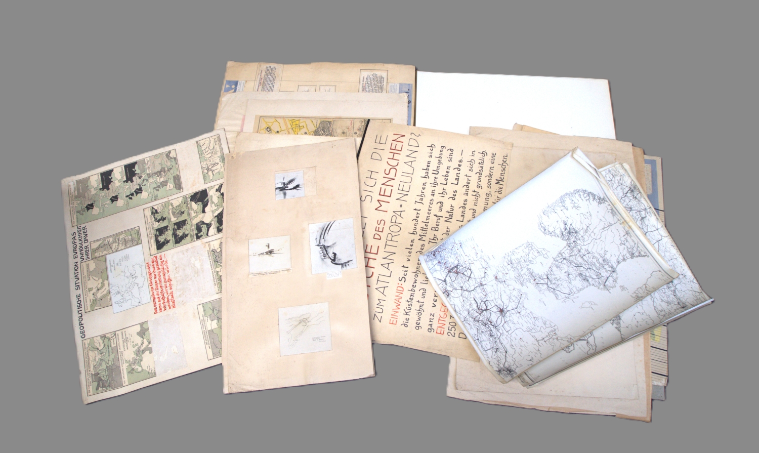 "Venezia". Zweifarbige Karte mit aufmontiertem Vermerk "Venedig bleibt erhalten, doch liegt durch Schliessung der Molen in einem Lagunen-Binnensee". "Atlantropa". Karton mit Originalentwurf in Bleistift "Aus der Maschine in den Acker", mit gewagter Zukunftsarchitektur. - Schautafel. "Wie stellt sich die Psyche des Menschen zum Atlantropa-Neuland?". - Und vieles, vieles mehr. – Gebrauchsspuren, vereinzelte Bräunungen, Einrisse, wenige Ausrisse, hier und da Läsuren, meist aber ordentlich und in den Darstellungen oft sehr gut erhalten.