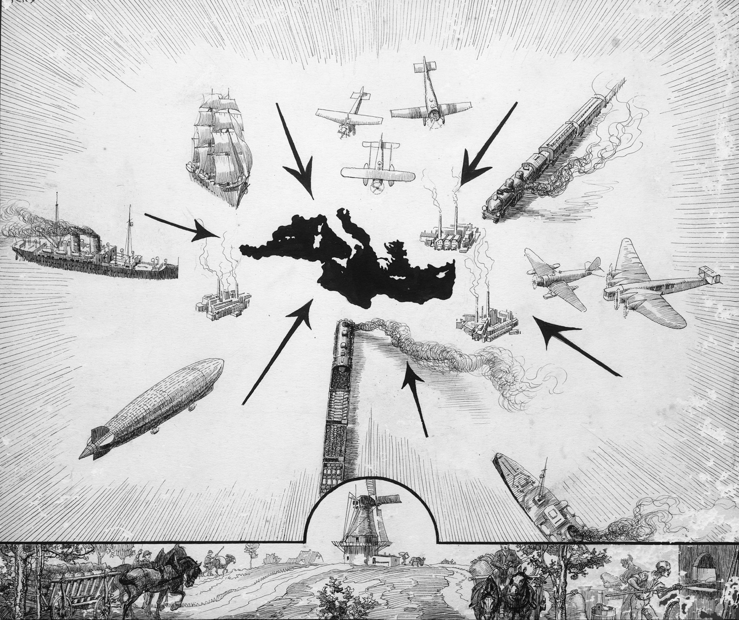 7) "Geopolitische Situation Europas - Unmöglichkeit ihrer Dauer". - Montagekarton mit 9 (statt einst 11) Darstellungen (2 abgelöst).