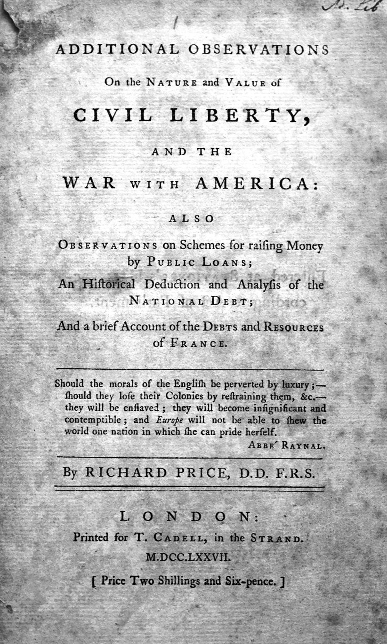 Price, Richard. Additional observations on the nature and value of civil liberty, and the war with America. Also observations on schemes for raising money by public loans; an historical deduction and analysis of the national debt. XVI, 176 S. 21 x 13,5 cm. HLeder d. Z. (berieben und etwas bestoßen; Gelenke angeplatzt). London, Cadell, 1777.