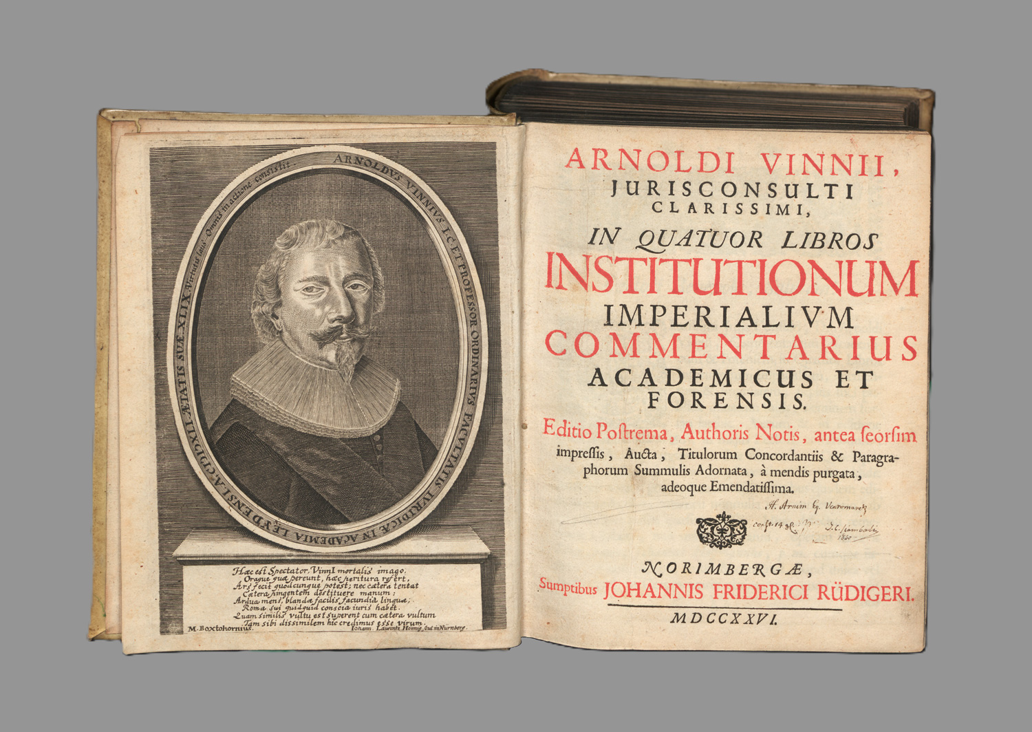 VD18 14737949. – Nürnberger Ausgabe des philologisch-historischen Kommentars zu den Institutiones Iustiniani, der selbst zu einem weit verbreiteten Standardlehrbuch der Rechtswissenschaft wurde. – Titel mit altem Besitzeintrag und vertikalen Quetschfalten, sonst wohlerhalten. – Beigebunden: Johann Gottlieb Heineccius. In Arnoldi Vinnii commentarium in quatuor libros Instituitionum imperialum notae. Nunc primum seorsim editae. 1 Bl., 92 S. Frankfurt, Franz Varrentrapp, 1732. - Erste Ausgabe. - Arnoldus Vinnius. Selectarum juris quaestionum libri duo. Editio nova. 3 Bl., 210 S. Ebenda 1733.