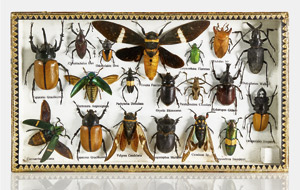 Schaukasten mit Vögel, Insekten, Schmetterlingen und einem Armadillo
