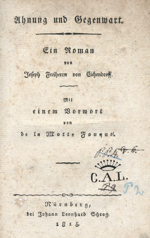Goedeke VIII, 185, 6. – Erste Ausgabe seines ersten Prosawerks, eines der seltensten Bücher der deutschen Romantik. Eichendorff war erst 23 Jahre alt, als er seinen Entwicklungsroman nach dem Vorbild des Wilhelm Meister zu schreiben versuchte. "Die Sprachkraft des ... Autors ist bewundernswert; seine Prosa strömt ruhig und melodisch dahin und umschließt über fünfzig oft erlesen schöne Lieder, z. B. 'O Täler weit, o Höhen', 'Ein Stern still nach dem andern fällt', 'Laß mein Herz, das bange Trauern' und 'Die Welt ruht still im Hafen'" (KLL 848). Einer der großen Romane der deutschen Romantik und zugleich eine Sammlung einiger ihrer schönsten Lieder. – Etwas stockfleckig, einige Blatt auch mit Wasserrand. Titel gestempelt (gekrönte Initialen "C. A. L.") und mit mehreren gestrichenen Signaturen. Unbeschnittenes, breitrandiges Exemplar.