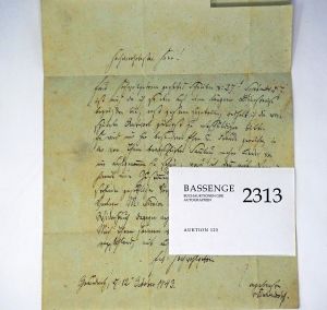 Eichendorff, Joseph Frhr von, Dichter und hoher preußischer Staatsbeamter, Hauptvertreter der dt. Spätromantik, dessen Gedichte zahlreiche Vertonungen erfuhren (1788-1857). Eigh. Brief m. U. "v Eichendorff". 1 S. Doppelblatt mit Adresse und Lacksiegel. Gr. 4to. Graudenz 12.X.1843.