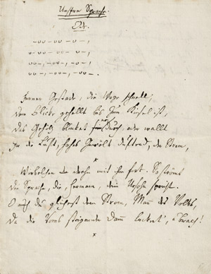 "Unssre Sprache. Ode". 28 Zeilen. Darüber 4 Zeilen mit Metrums-Angaben. Eigenhändige Niederschrift der Ode, die unter dem Titel "Die deutsche Sprache" bekannt ist: