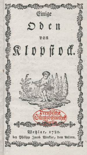 Klopstock, (Friedrich Gottlieb). Einige Oden. 55 S. 17 x 10,5 cm. Pappband d. Z. (berieben, VDeckel mit Bibliothekssignet). Wetzlar, Philipp Jacob Winkler d. Ä., 1780.