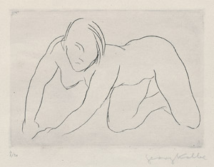 Sitzender, stark nach vorn gebeugter Akt. Radierung auf sehr feinem Chinabütten. 12,7 x 17,6 cm (Plattenrand); 25,4 x 31,5 cm (Blattgröße). Signiert. Auflage 150 num. Exemplare. Um 1923/24. Rosenbach 44, Söhn HDO 51905-4.
