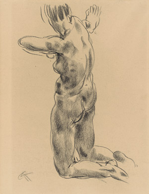 Die menschliche Figur in ihren unterschiedlichsten Bewegungs- und Ausdrucksformen ist das zentrale Thema in Kolbes Werk. Mit wenigen Strichen von virtuoser Sicherheit und den sensibel eingesetzten Schattierungen gelingt Kolbe die Wiedergabe des dreidimensional-plastischen Körpers. So vergegenwärtigt der Künstler auch in seinen zahlreichen Zeichnungen dem Betrachter stets das Skulpturale. Es handelt sich bei dem vorliegenden Blatt wohl um eine Studienzeichnung zu der 1929 entstandenen Bronze "Sitzende" (auch: Große Sitzende, Berger 127); zur Datierung liegt ein Brief der Enkelin Kolbes bei.