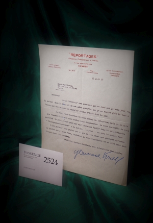 Krull, Germaine, aus der preuß. Provinz Posen stammende, international tätige, bedeutende Photographin und Kriegsberichterstatterin (1897-1985). Brief m. U. "Germaine Krull". In franz. Sprache. 1 S. Mit Briefkopf "Reportages. Groupement Photographique et Littéraire". Gr. 4to. Cannes 21.VI.1935.
