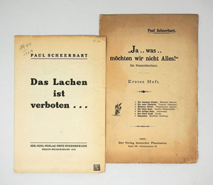 W.-G. 2. Lubasch-Meyer S. 2. – Erste Ausgabe der seltenen 2. Veröffentlichung, ohne den bei Lubasch genannten grünen Umschlag. – Gebräunt; unaufgeschnitten. – Dabei: Paul Scheerbart. Das Lachen ist verboten ... 1 Doppelblatt. 22 x 14,5 cm. Berlin, See-Igel-Verlag Fritz Nuernberger, 1929. - W.-G. 32. Erste Ausgabe. Eines von 287 nummer. Exemplaren. - Ecken geknickt.