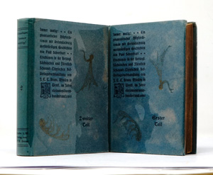 Scheerbart, Paul. Immer mutig! Ein phantastischer Nilpferderoman mit dreiundachtzig merkwürdigen Geschichten. 2 Bände. 4 Bl., 235 S.; 2 Bl., 250 S., 1 Bl. Mit zahlreichen Vignetten von Paul Scheerbart. 17 x 12 cm. Illustrierter blauer OPappband (Rücken etwas ausgeblichen, Ecken leicht bestoßen) mit Rücken- und Vorderdeckeltitel. Minden, J. C. C. Bruns, 1902.
