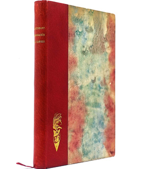 Scheerbart, Paul. Rakkóx der Billionaer. Ein Protzenroman. - Die wilde Jagd. Ein Entwicklungsroman in acht anderen Geschichten. 119 S. Mit Buchschmuck von Jossot und Holzschnitten von Felix Vallotton. 21 x 14 cm. OHleinen (leicht berieben und bestoßen) mit hübschem Buntpapierbezug. Leipzig, Insel, Weihnachten 1901.
