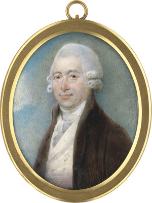 (1756 - 1825, London)Miniaturenpaar: Bildnis des Samuel Lord und seiner Gattin Martha, er in brauner Jacke und weißer Weste mit Halsbinde und Jabot, sie in graublauem Kleid mit schwarzer Spitzenstola und weißer Rüschenhaube mit blauem Band