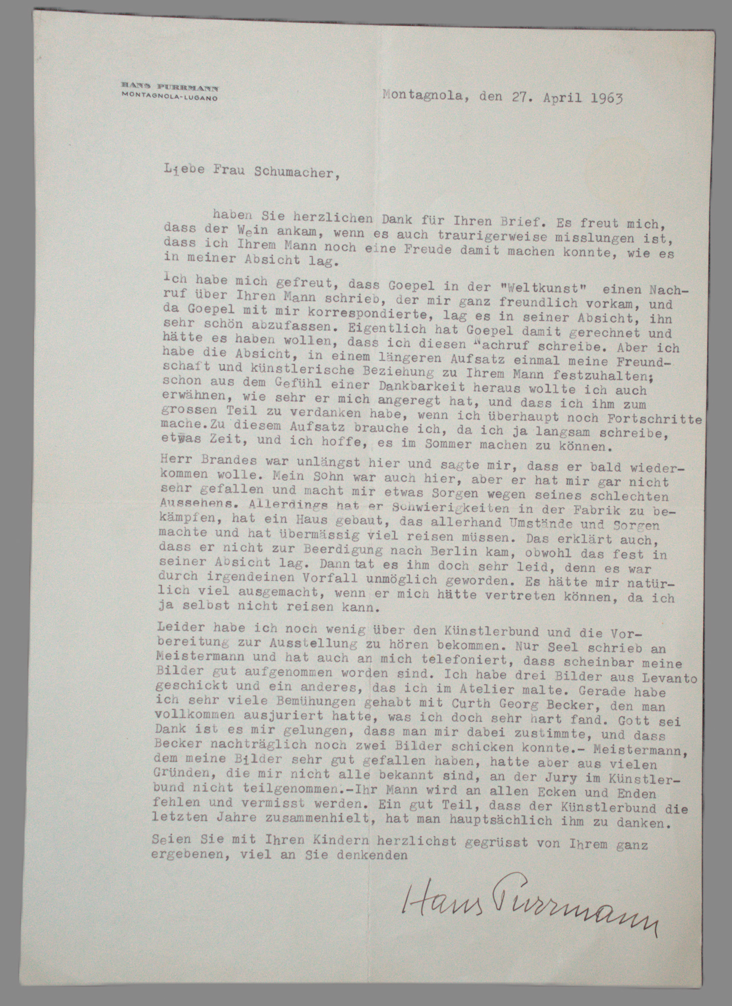(1880-1966)Brief an die Witwe des Malers Ernst Schumacher. 1963