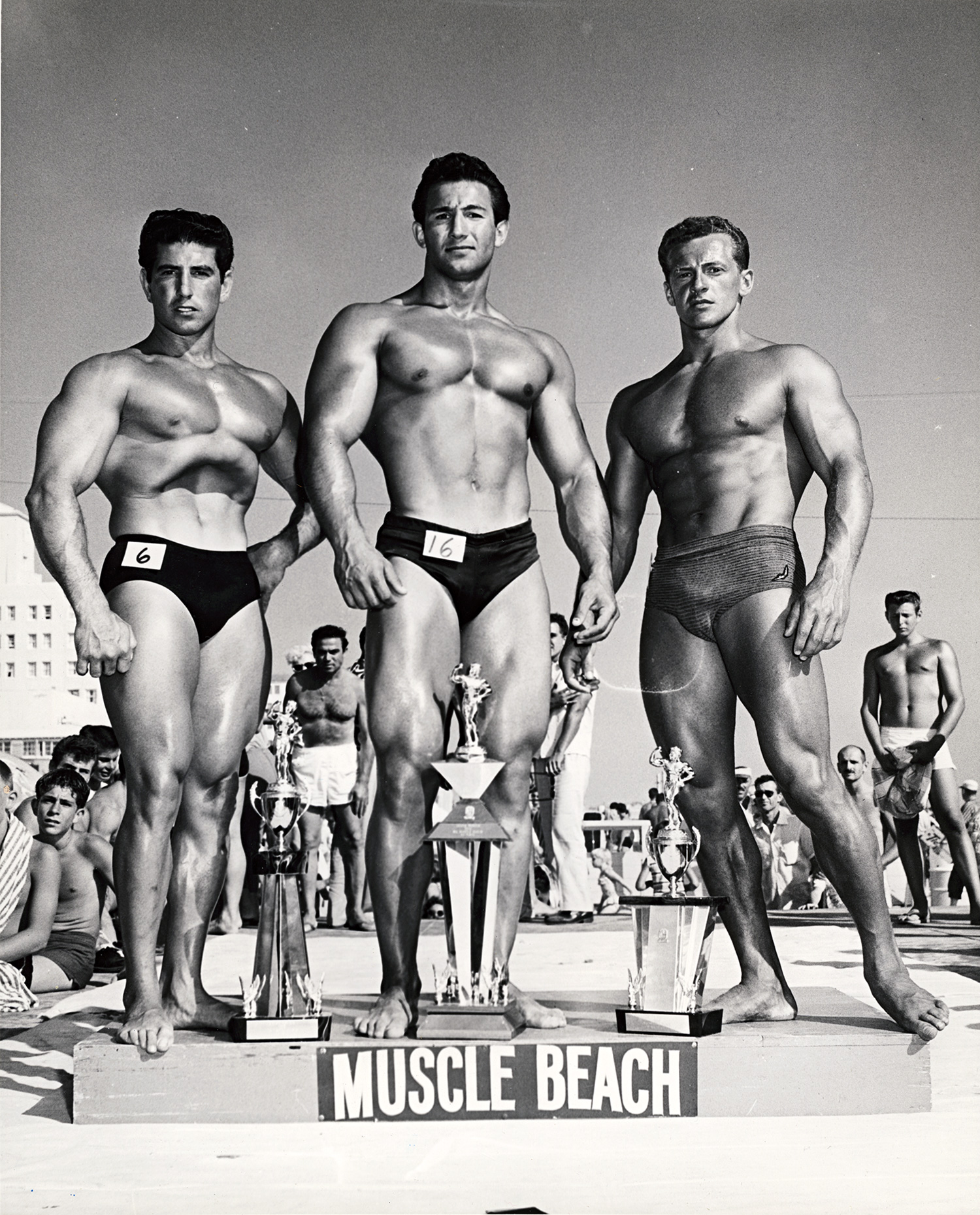 (Bruce Bellas, 1909-1974)Three winners of bodybuilding contest, Muscle Beach, Santa Monica: Charles Collras, Hossein Shokouh und Jerry Boily; Nude of John Manning