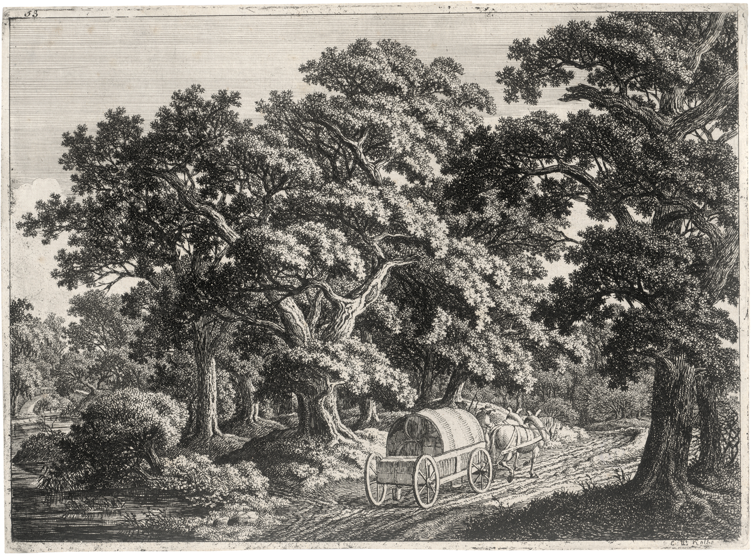 Los 5601 - Kolbe, Carl Wilhelm - Waldgegend: Auf einem Weg vorn ein Planwagen mit zwei Pferden - 0 - thumb