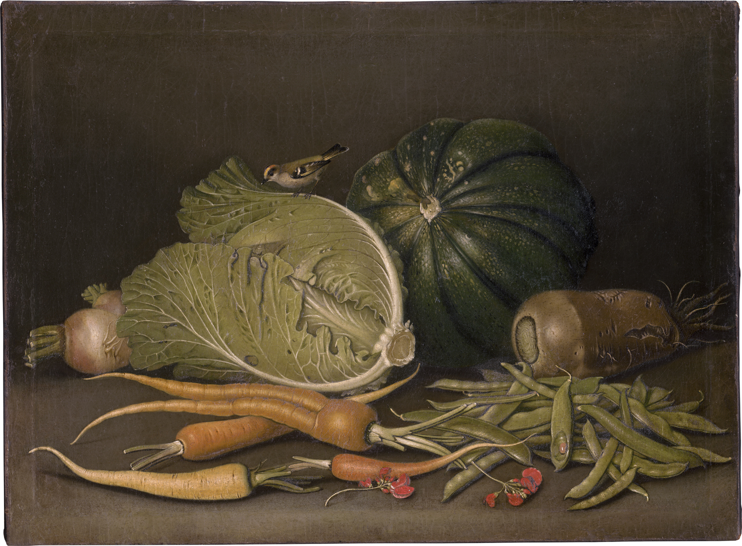 (1715-1778, Erfurt)Gemüsestillleben mit Weißkohl, Kürbis ... und einem Fink