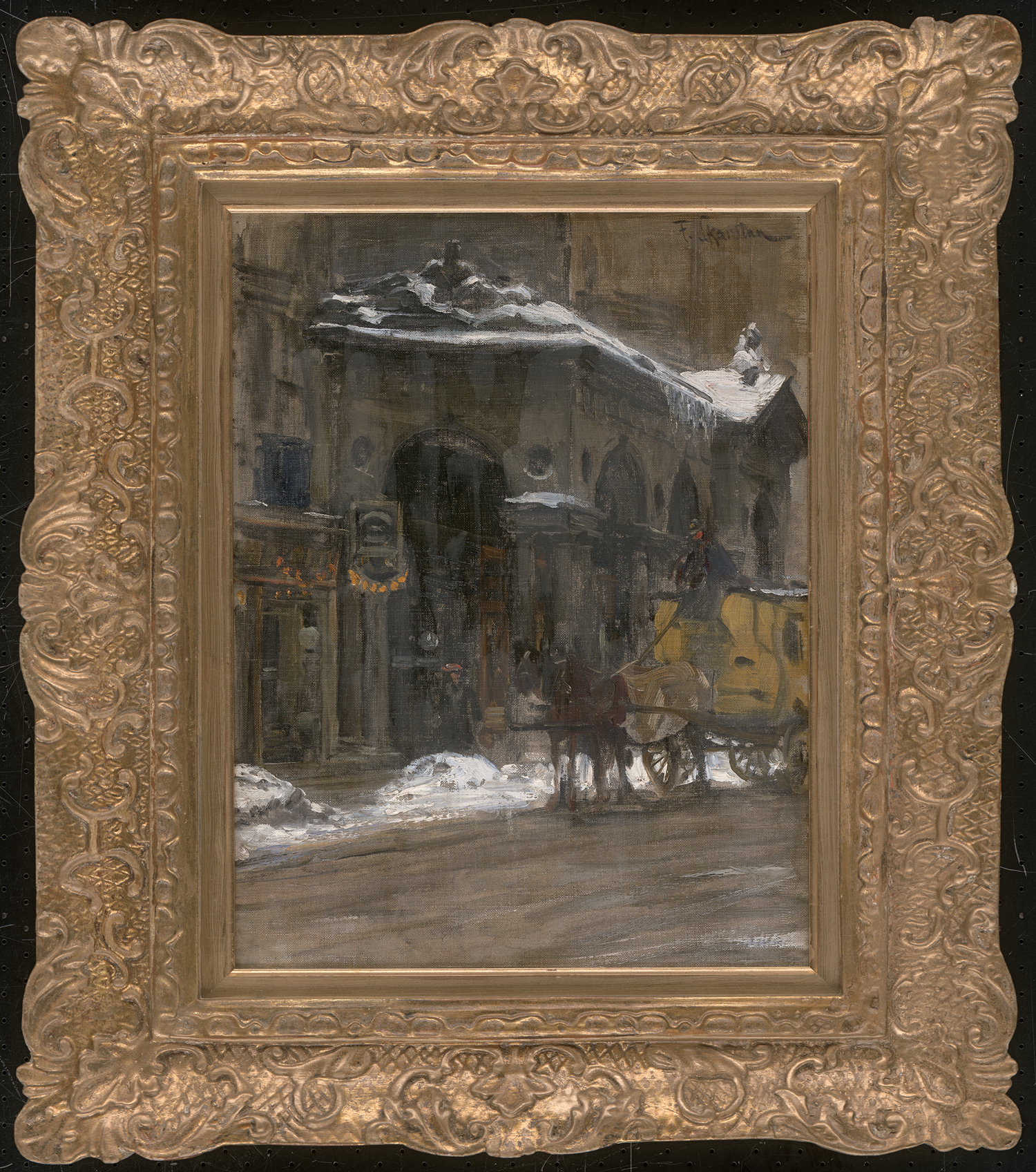 (1849-1910, Berlin)Pferdedroschke vor der Mohrenkolonade im verschneiten Berlin