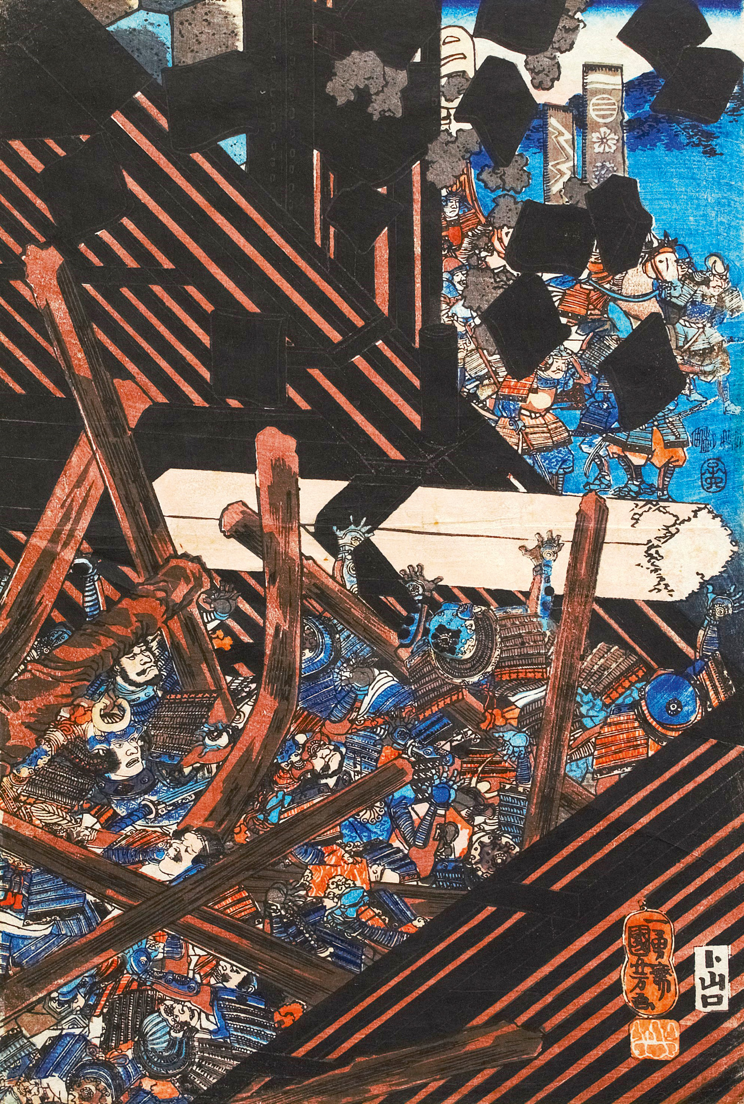 4 Ukiyo-e Farbholzschnitte, meist von Utagawa Kuniyoshi. Edo (Tokio) Mitte 19. Jahrhundert