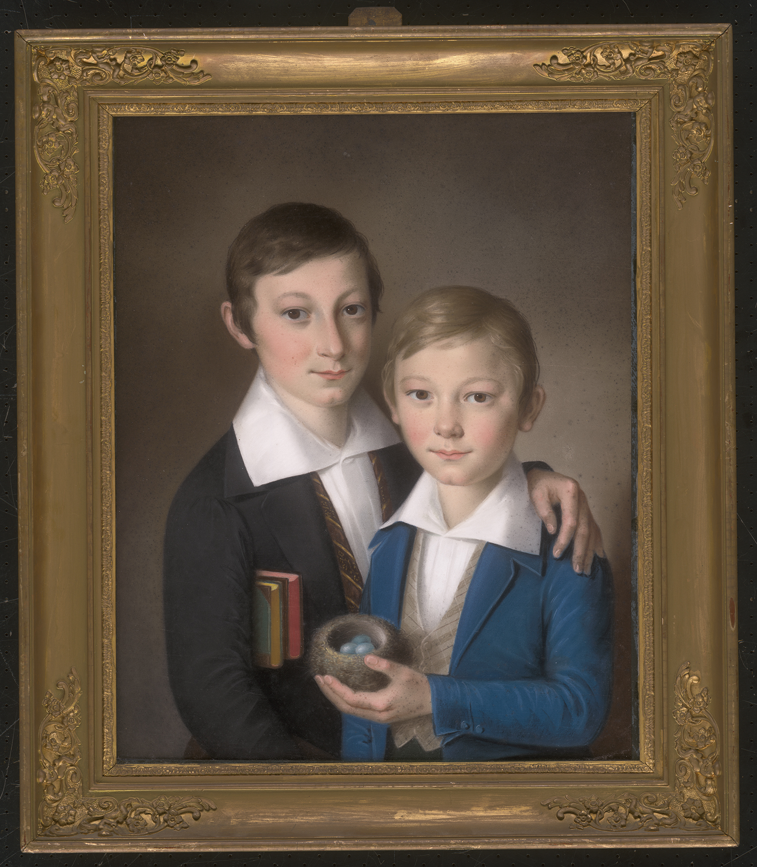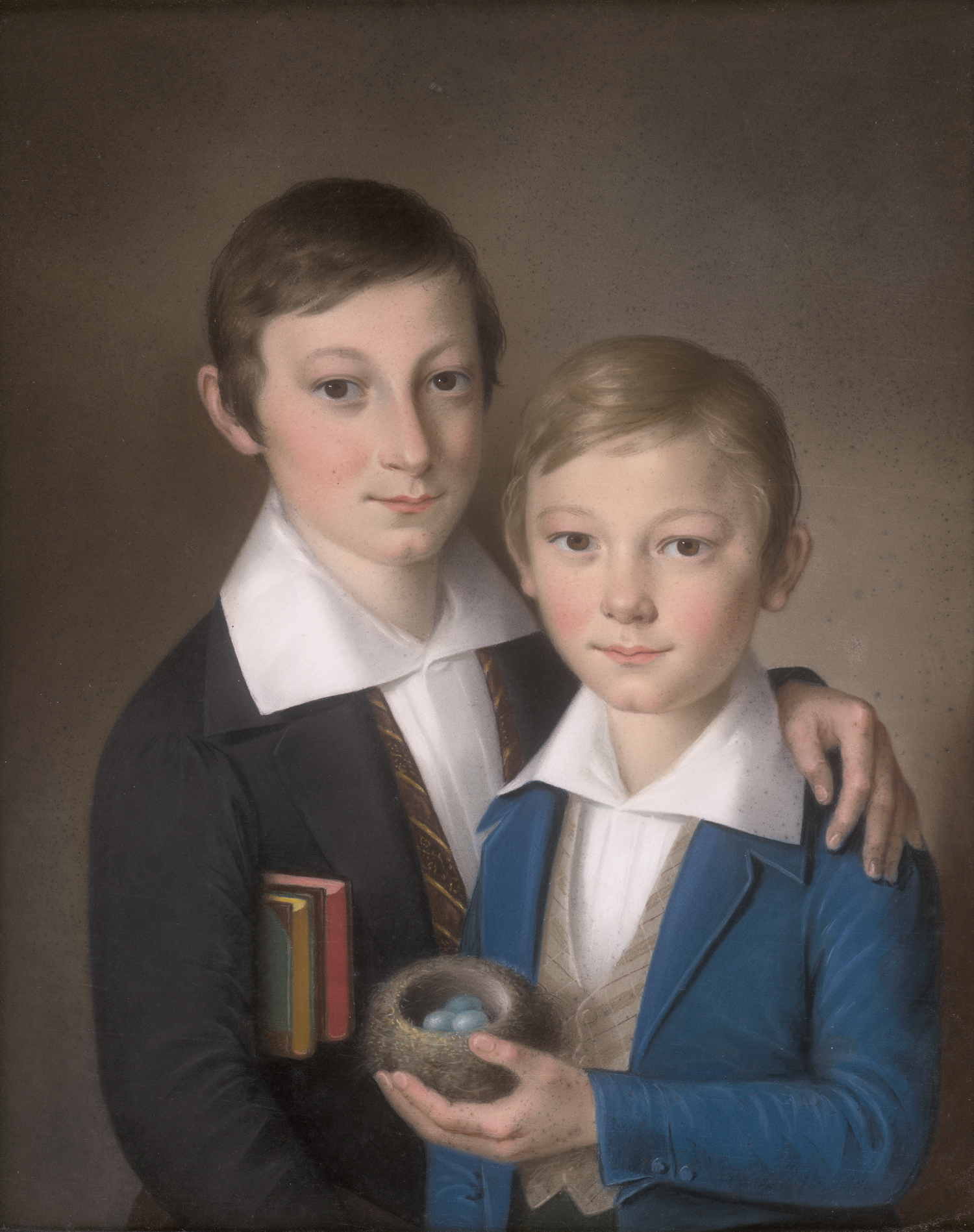 Anfang 19. Jh. Porträt zweier Brüder, der ältere mit Büchern unter dem Arm, der jüngere mit Vogelnest und Amseleiern