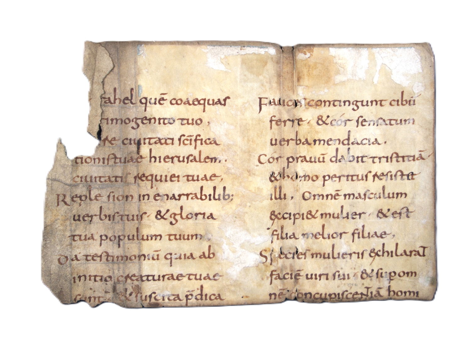 Sehr schönes Fragment einer frühmittelalterlichen Bibelhandschrift mit Textstellen aus dem Buch Jesus Sirach, dem kanonischen Buch Ecclesiasticus der Vulgata: "[Miserere plebi tuæ, super quam invocatum est nomen tuum: et Is]rahel quem coæqua[sti p]rimogenito tuo. [Misere]re civitati sanctificatiónis tuæ, Hierusalem, civitáti requiei tuæ. Reple Sion inenarrabilibus verbis tuis, et gloria tua populum tuum. Da testimónium quia ab initio creaturæ tuæ sunt, et suscita prædica[tiones quas locuti sunt in nomine tuo prophetæ priores]“ (Sir 35,23-26), also etwa: "Erbarme dich deines Volkes, über dem dein Name genannt ist, und Israels, das du zu deinem Erstgeborenen gemacht hast. Erbarme dich Jerusalems, der Stadt deines Heiligtums, der Stadt deiner Ruhe. Erfülle Zion mit deinen unaussprechlichen Worten und dein Volk mit deiner Herrlichkeit. Gib Zeugnis für deine Geschöpfe von Anbeginn an und verkünde die Botschaften, die die früheren Propheten in deinem Namen verkündet haben" (Sir 36:14-19). Das Buch Jesus Sirach fehlt in der Lutherbibel, für die es zu den apokryphen Texten gehört und nicht in den Kanon aufgenommen wurde.